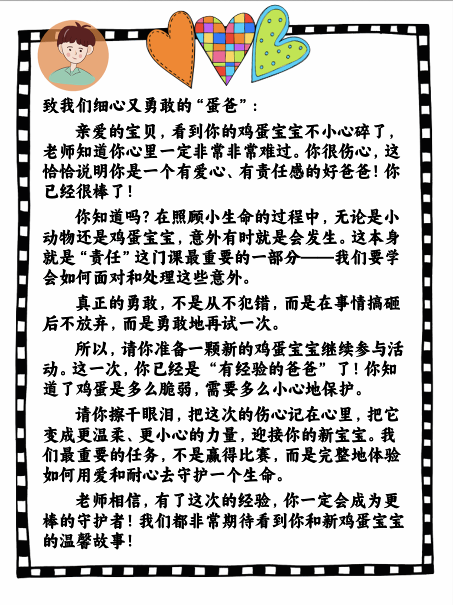 Meanwhile, children who accidentally shattered their egg babies received a consolation letter prepared by the teachers. The letter aimed to comfort them, help them understand the weight of the word "responsibility," and encourage them to learn from the experience and care for their new egg babies with extra care in the following activities. At the end of the week, these resilient and responsible "egg parents" who refused to be discouraged by failure were awarded a special certificate.
