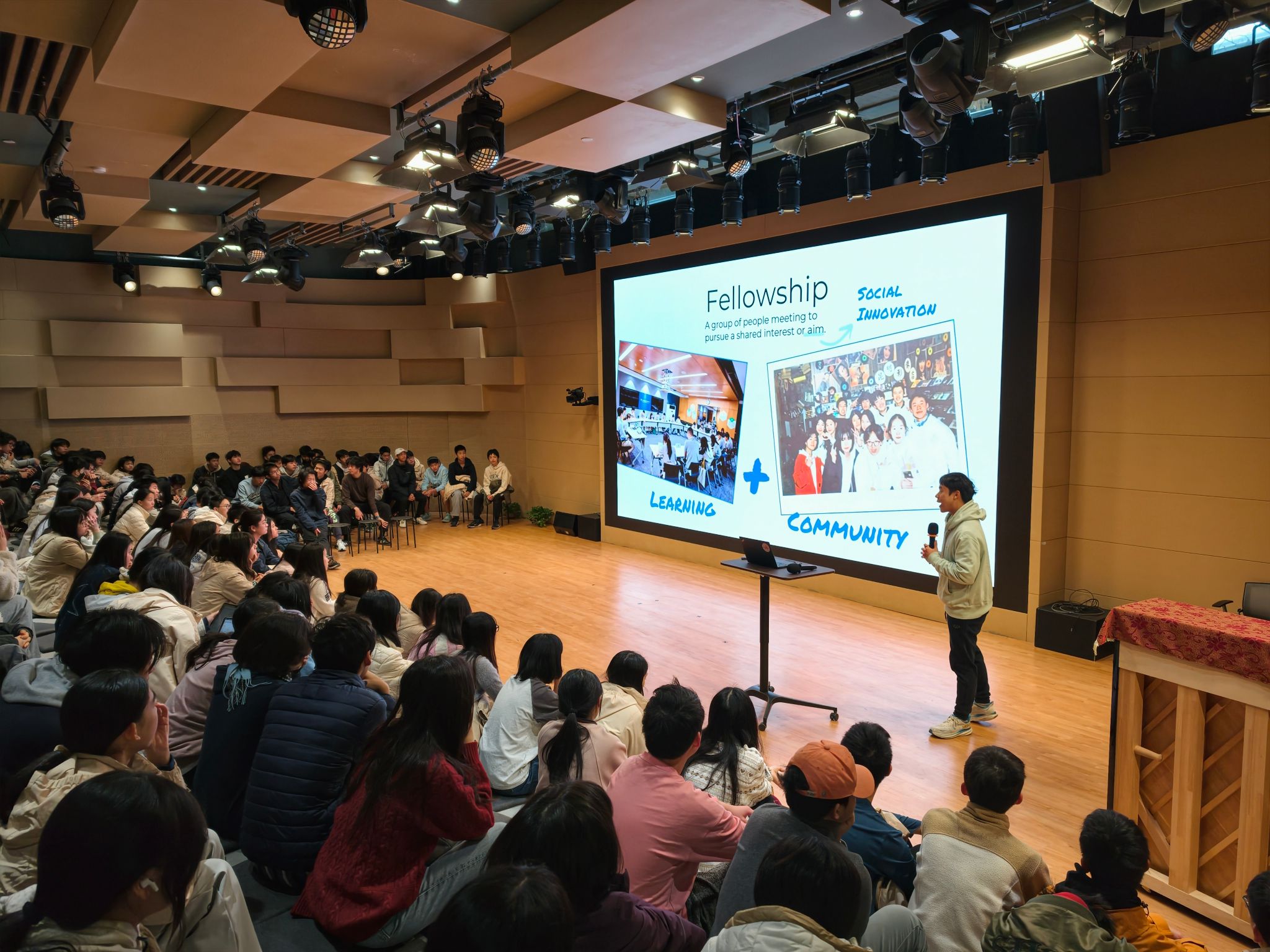On December 10, 2025, a morning assembly was held for the Grade 10 students of SHSID. A senior student, Aaron, shared his experience in the “Fellowship for Change” program, a social innovation initiative organized by Columbia Global Centers at Beijing.