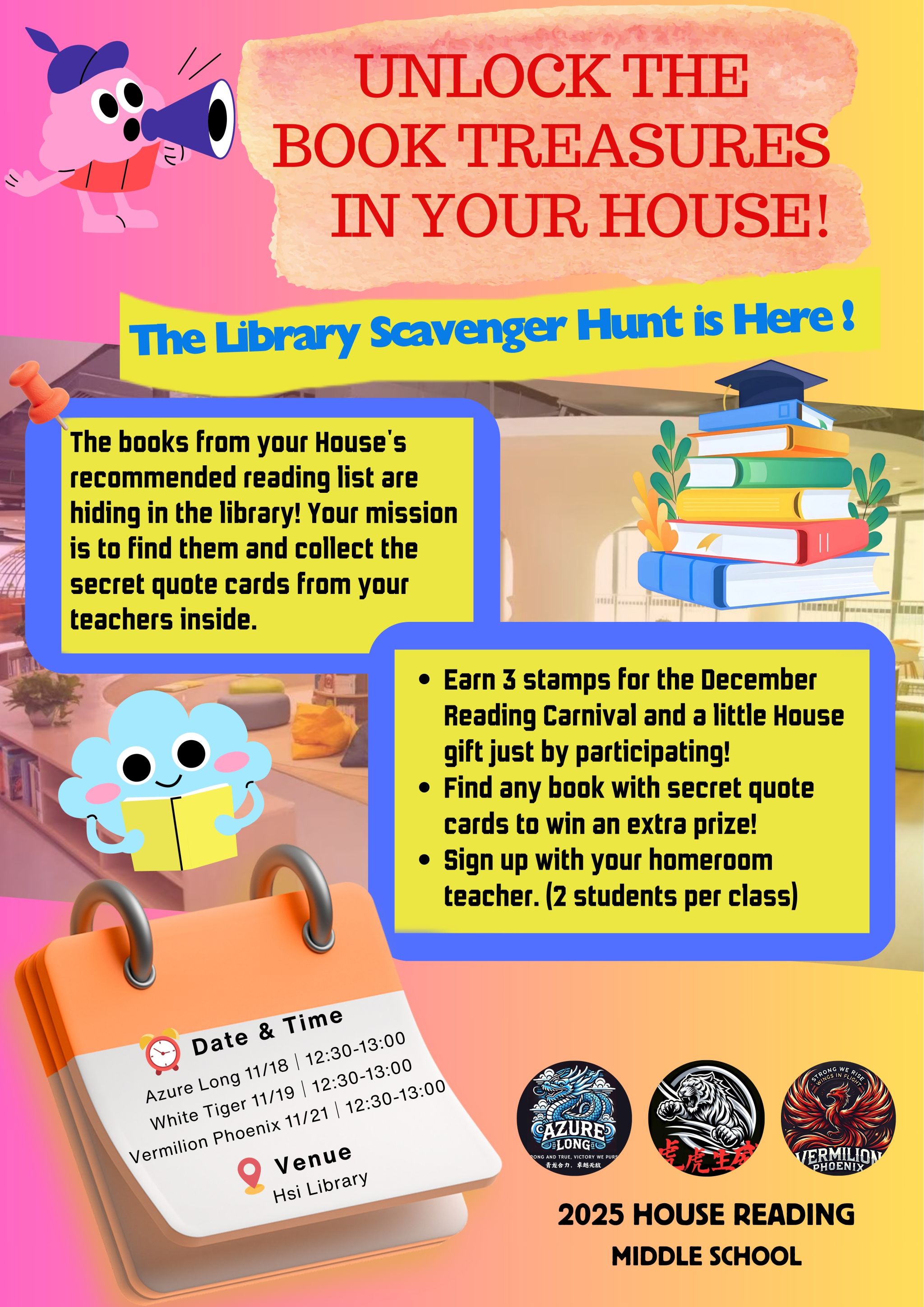 As the autumn breeze arrived, the fragrance of books filled the campus. In the 2025 school year, the Middle School Section launched the semester-long 2025 House Reading Event. From September’s curated reading list to October’s Teacher Book Salons, November’s library treasure hunt and lecture, and finally December’s Reading Carnival, the four chapters formed an immersive journey that blended reading, interaction, and experience. Throughout the semester, students engaged in reflective reading, lively discussion, and joyful participation, allowing reading to become a vibrant and natural part of their daily learning and life.