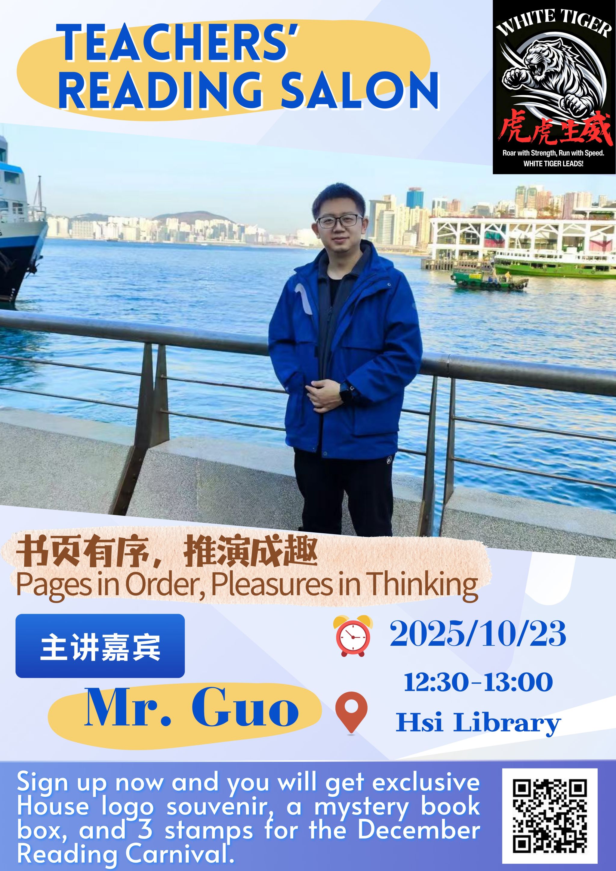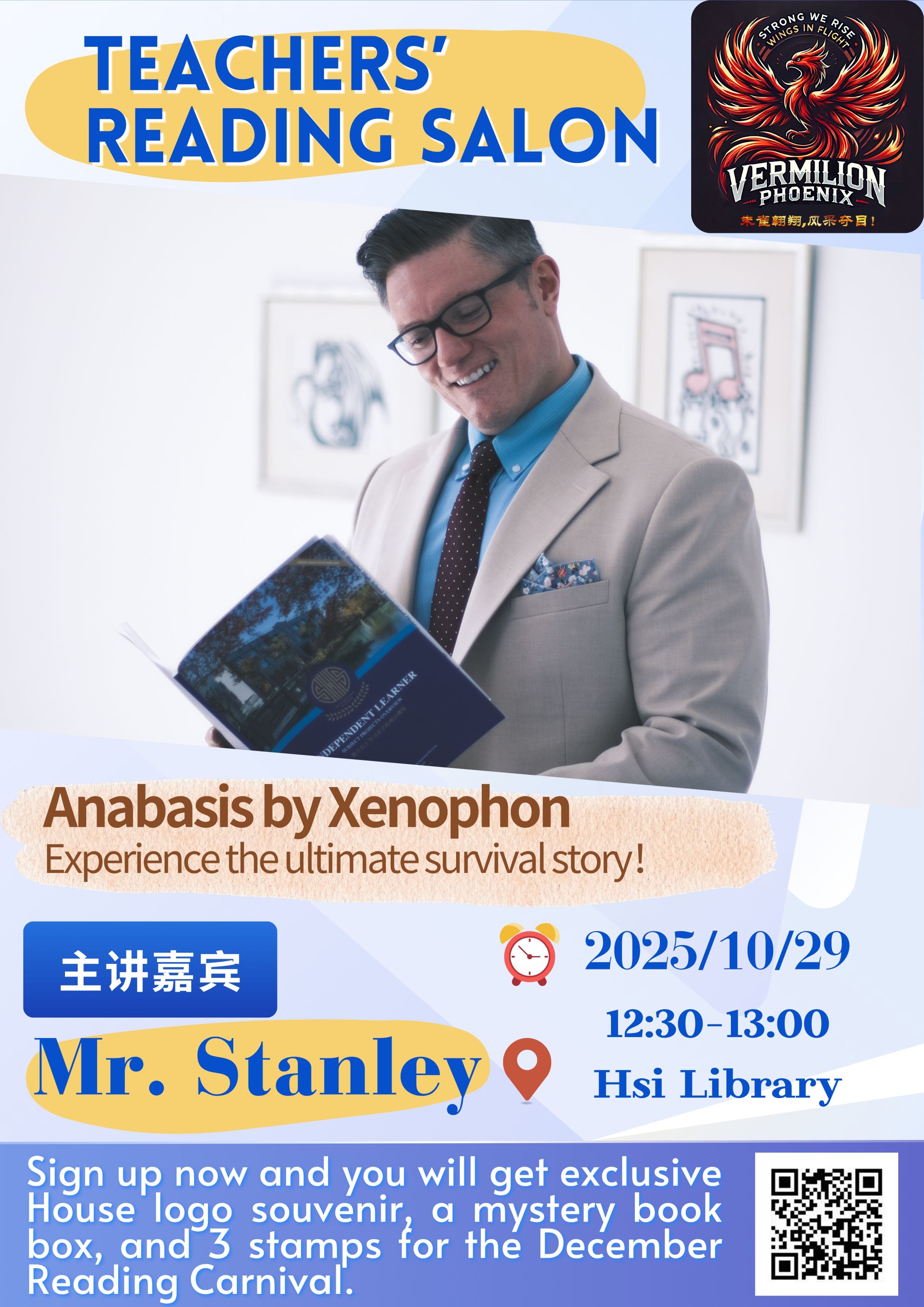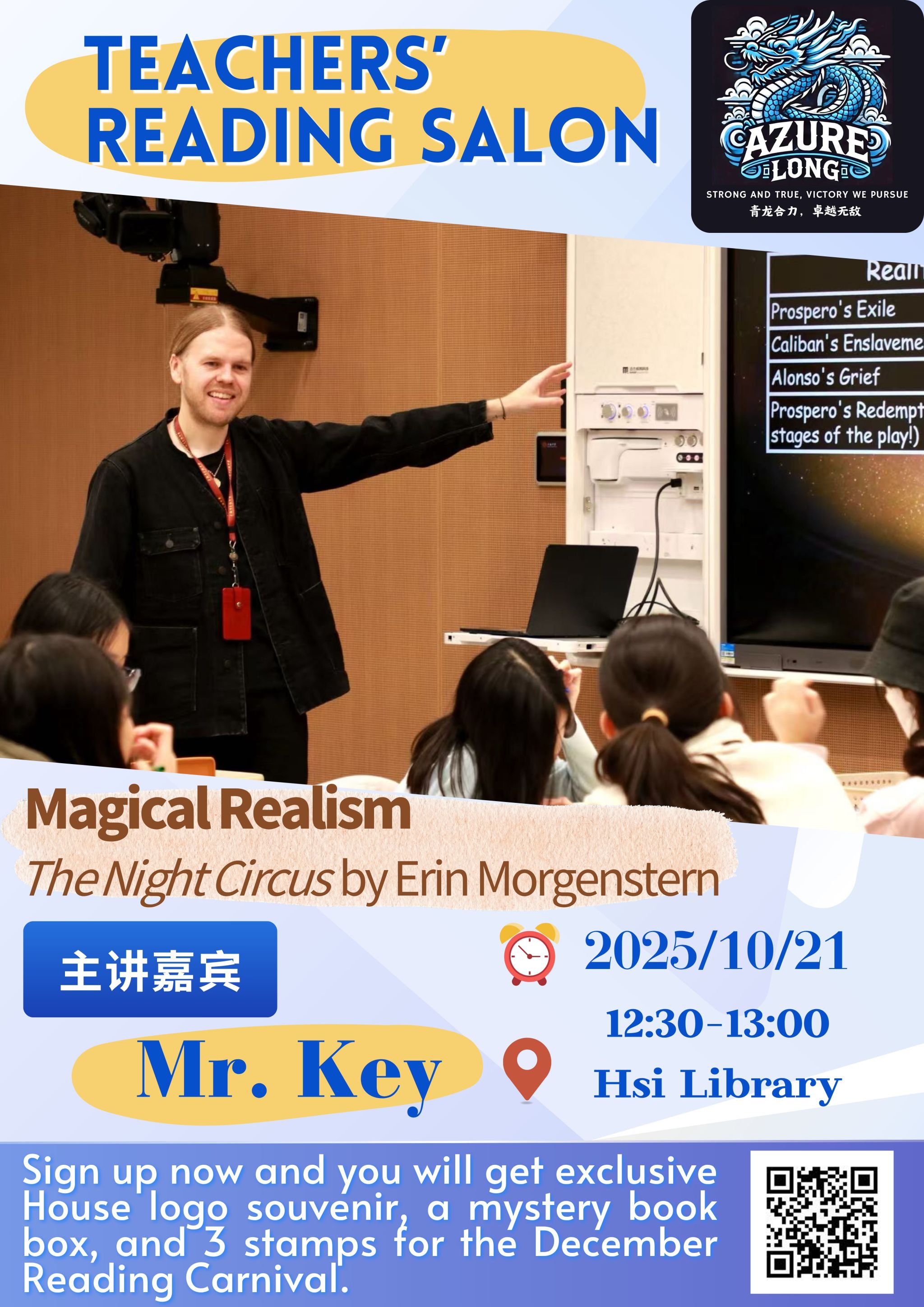 In the refreshing days of October, the much-anticipated Teacher Book Salons took the stage. Uniquely, the three speakers were selected entirely through student voting, making them the reading guides students most wanted to hear from. Mr. Key from Azure Long House opened with The Night Circus, using immersive excerpts to lead students into the mesmerizing borderland between fantasy and reality. Mr. Guo from White Tiger House introduced The Beauty of Mathematics, Math Girls, and Game Theory, showing how mathematics can be interdisciplinary, warm, and thought-provoking—from the structure of language to randomness, cooperation, and competition. Mr. Stanley from Vermilion Phoenix House retold the intertwined stories of two medieval queens with dramatic storytelling, transforming the library into a vivid stage of political intrigue and revealing the human choices behind history. In each salon, students listened, questioned, reflected, and laughed. Teachers stepped forward as readers; students engaged as thinkers. These moments demonstrated that reading is not merely an assignment but a way of understanding the world, oneself, and life.