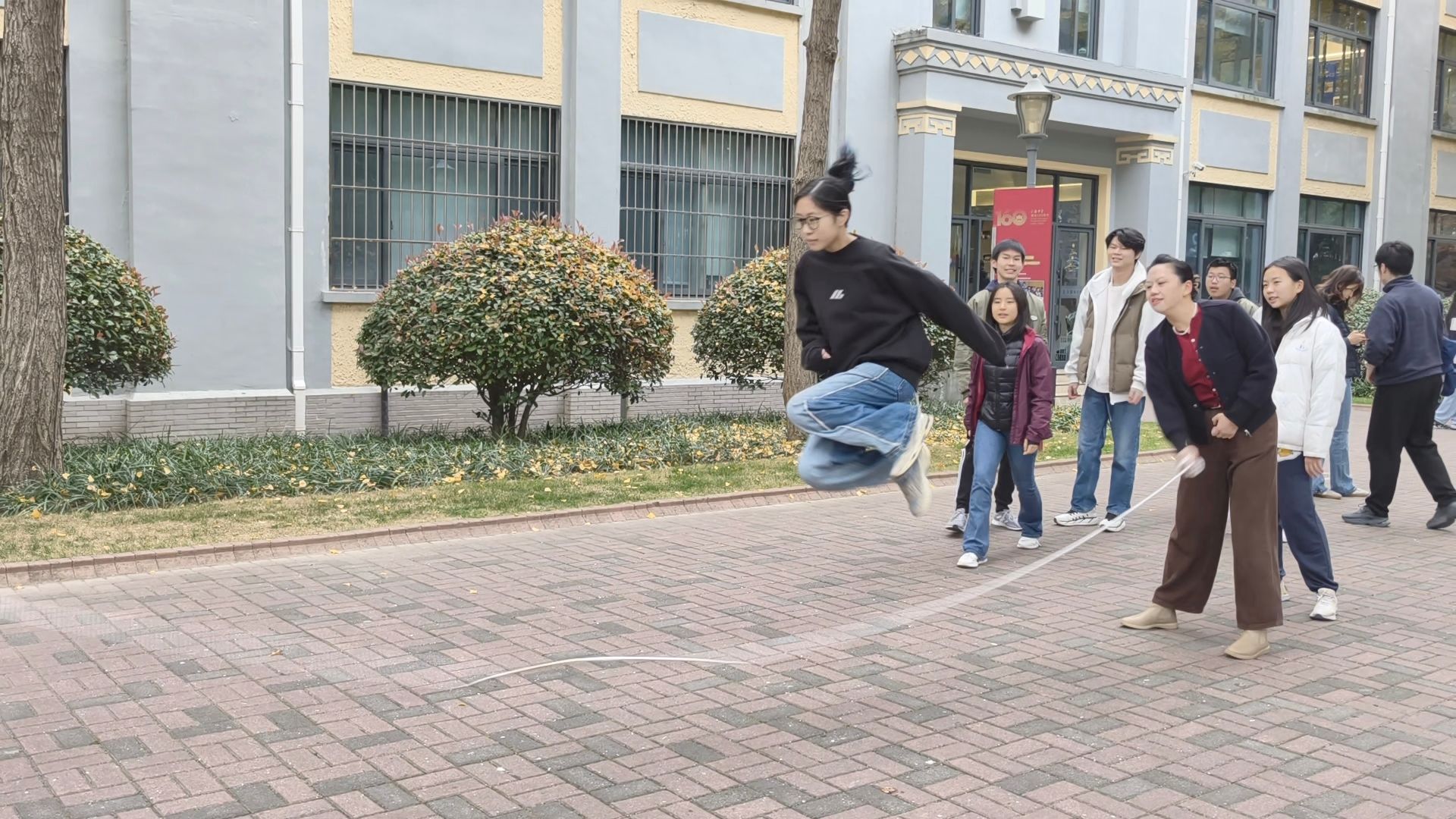 When the crisp bell rang, students exited their classrooms and lined up neatly in front of the Xianmian building. With the rhythmic "thump-thump" of the long rope, each student nimbly jumped into the loop and leaped out in harmony, as laughter and chatter gradually chased away the morning drowsiness. Teachers were also moved by this joyful atmosphere. They took videos of their students and even joined the game too.
