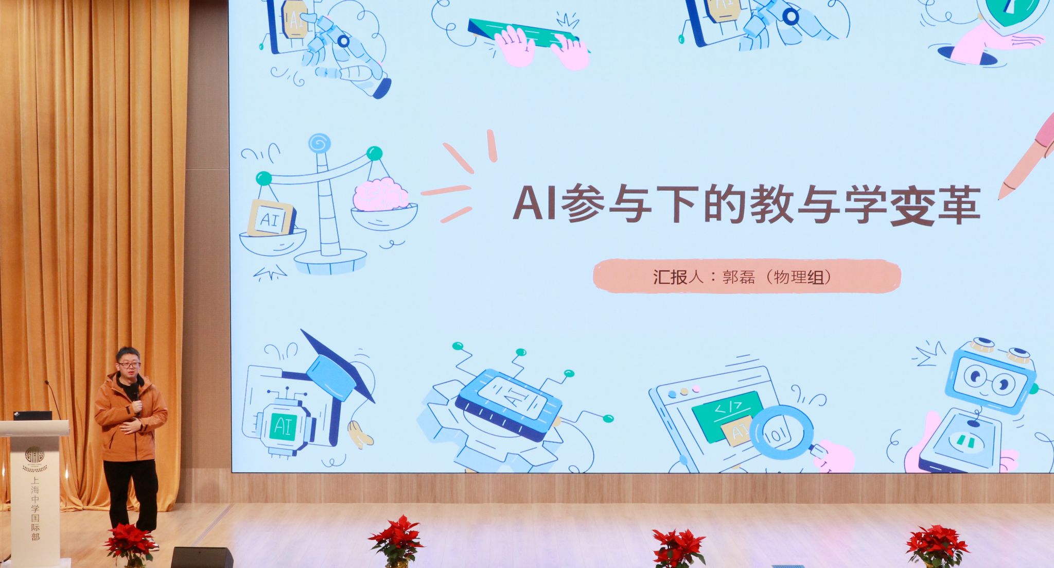 Next, Mr. Guo Lei stepped forward, presenting "Transformations in Teaching and Learning with AI Participation". From the perspectives of both teaching and learning, he traced the changes and challenges AI brings before, during, and after class. Drawing on authentic classroom practices, he shared how the middle school physics team has integrated AI purposefully into lessons guided by clear learning objectives.