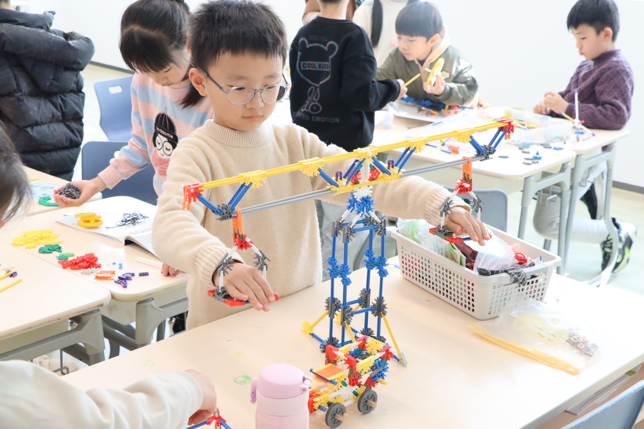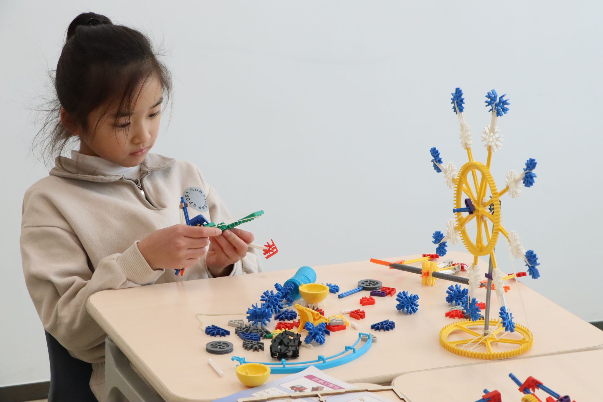 “At first, the support kept tilting - we tried three times before we found the right center of gravity,” one student shared, holding up their completed crane model. From repeated trial and error to continuous refinement, the classroom becomes a genuine space for hands-on practice. Principles of structural stability are embedded in each small adjustment, teamwork is reflected in the smooth exchange of materials, and problem-solving skills grow through discussions such as how to make a Ferris wheel rotate more smoothly.