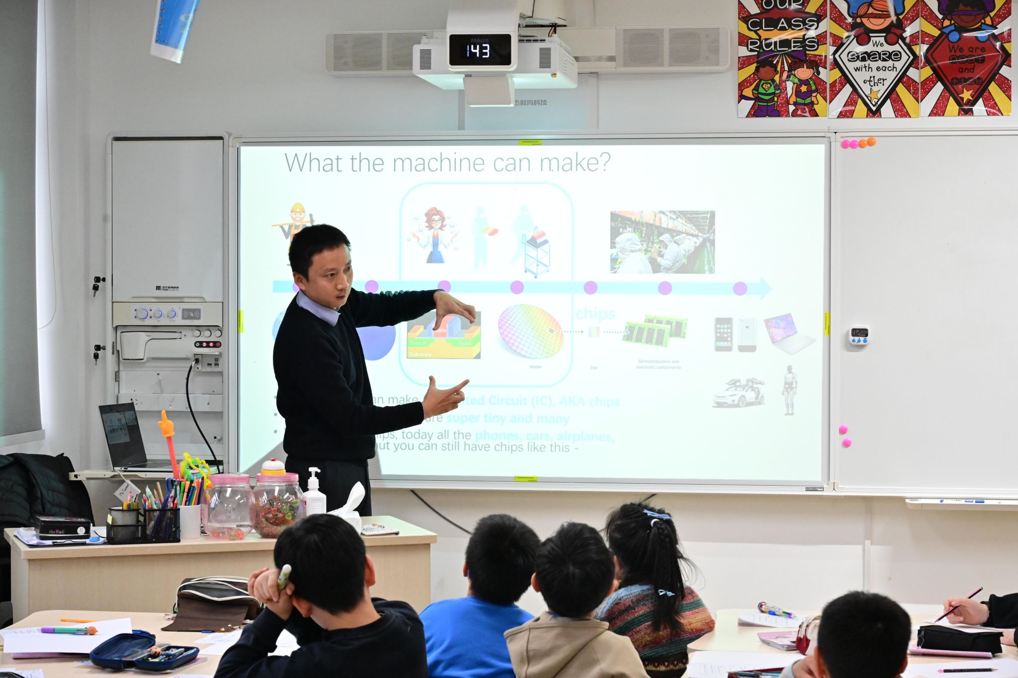 Meanwhile, in the semiconductor session led by Ryan's dad from Class 2-1, students were introduced to integrated circuits, commonly known as "chips." They learned that transistors, the core components of chips, are as vital as cells are to living organisms. Chip structures are smaller than viruses, with a single chip containing over ten times the number of transistors as the global population which are also all manufactured in highly clean environments. Through simplified, kid-friendly explanations, students understood that semiconductors are at the heart of modern life, powering devices like smartphones and cars. Games like “Stamp Game," "Find the Tiny Mistake," and fun Q&A sessions helped deepen their understanding in an enjoyable way.