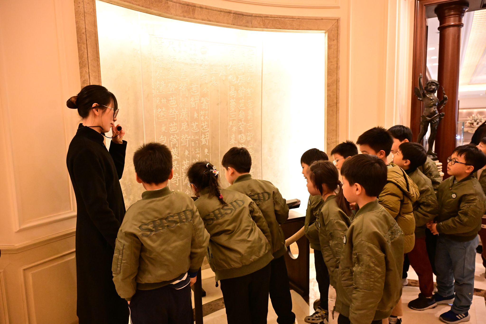 Next, students explored the guqin exhibition corridor, learning about the instrument's history and unique notation system. On the second-floor balcony, they gazed up in awe at the magnificent golden dome. The tour also included the underground hall and South Hall, where clover-patterned walls and acoustic panels sparked curiosity and discussion. Along the way, portraits of jazz musicians prompted lively guessing games about musical genres, adding to the excitement.