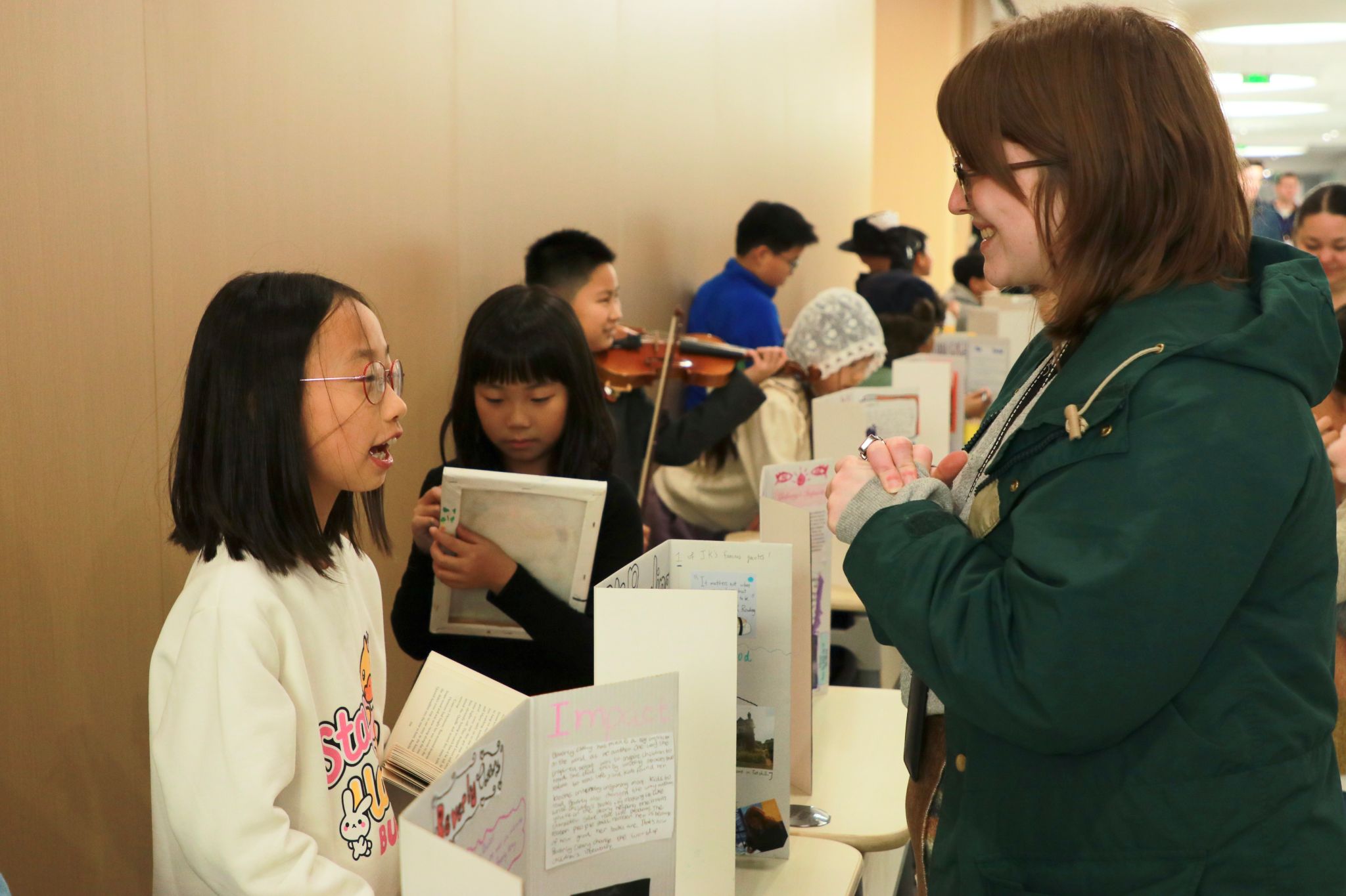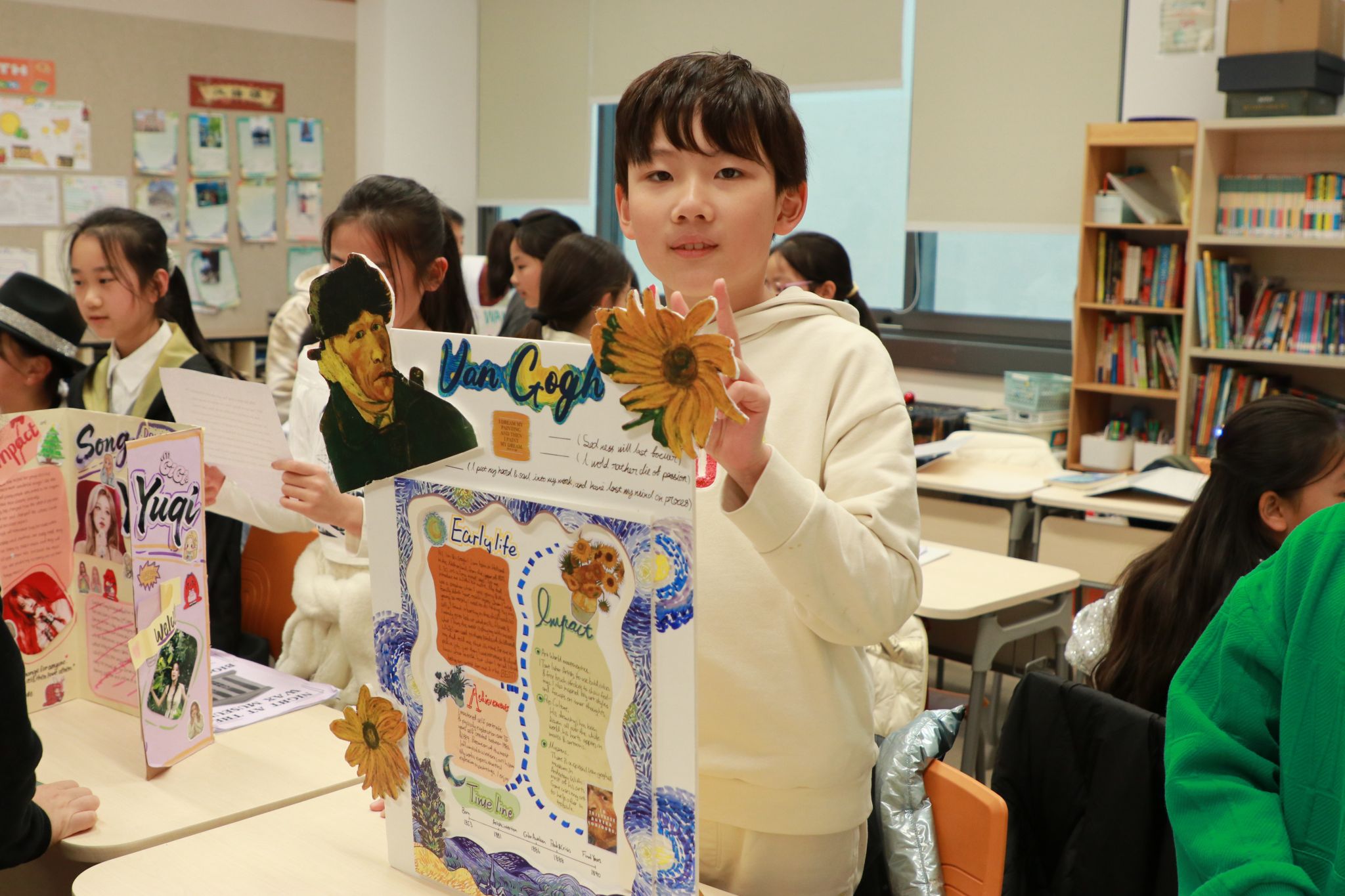 Leading up to the big event, students worked through each step of the project during their English classes. They carefully read biographies, practiced finding important information, and learned how to organize their ideas into clear sections – culminating in students writing informative paragraphs and creating vibrant display boards. These essential skills connected directly to our English learning goals, including reading informational texts, writing clearly about what students learn, and speaking with confidence.