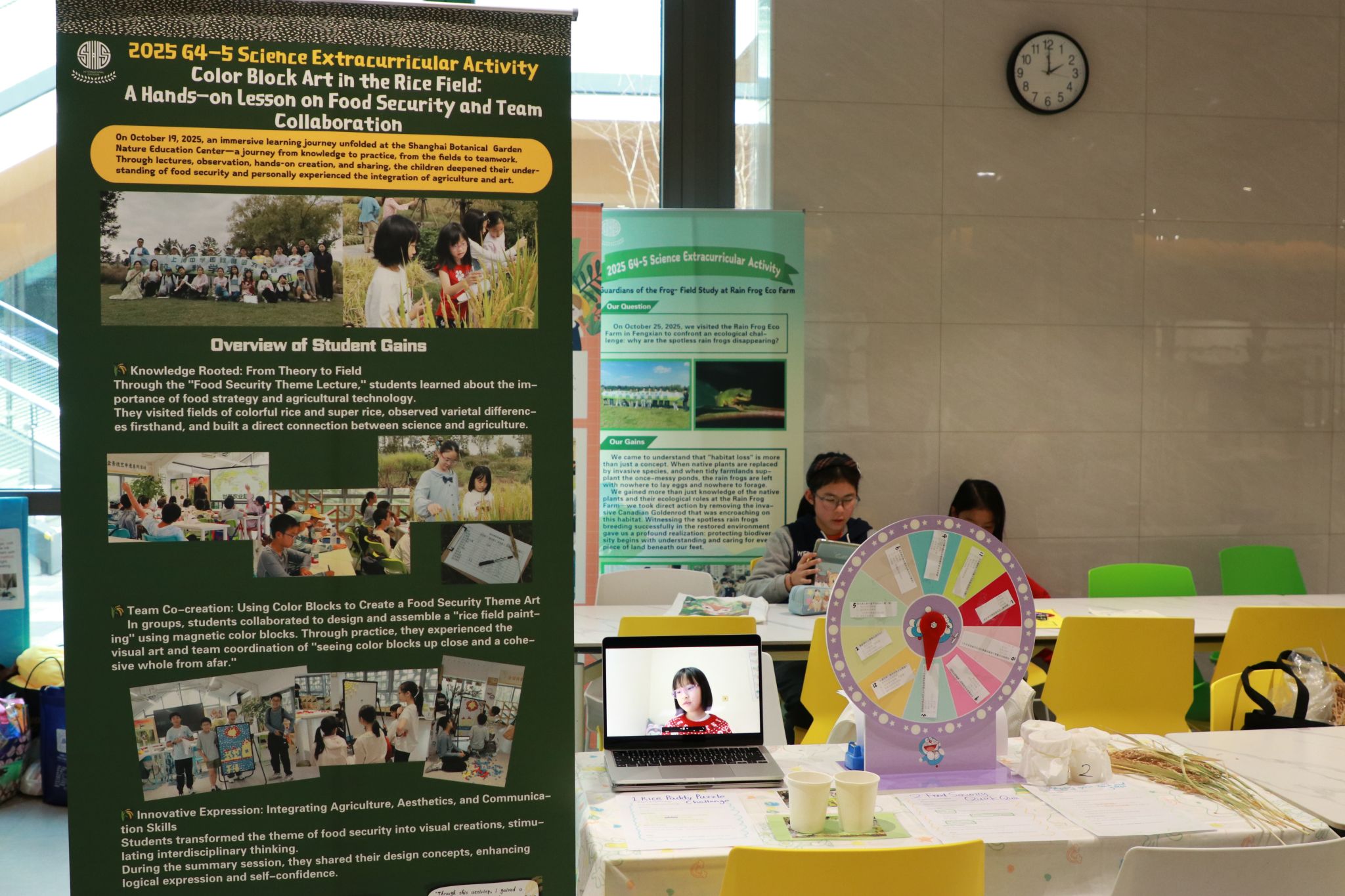 Particularly noteworthy was the collective showcase of the Grade 4-5 extracurricular science practice teams. Beginning three months earlier, five student teams, guided by teachers, conducted systematic field investigations at sites such as frog ecology farms, botanical gardens, and specimen museums. In fields and exhibition halls, students learned to record observations, collect data, and develop research projects, transforming textbook knowledge into authentic inquiry experiences. At the carnival, these teams confidently presented their outcomes through self-produced videos, illustrated posters, and engaging explanations, sharing insights into life patterns observed in nature and evolutionary stories uncovered through specimens. As students gathered to ask questions and exchange ideas, seeds of scientific curiosity quietly took root. This extended journey-from autumn exploration to winter presentation-not only strengthened research skills but also empowered students to become storytellers and ambassadors of science.