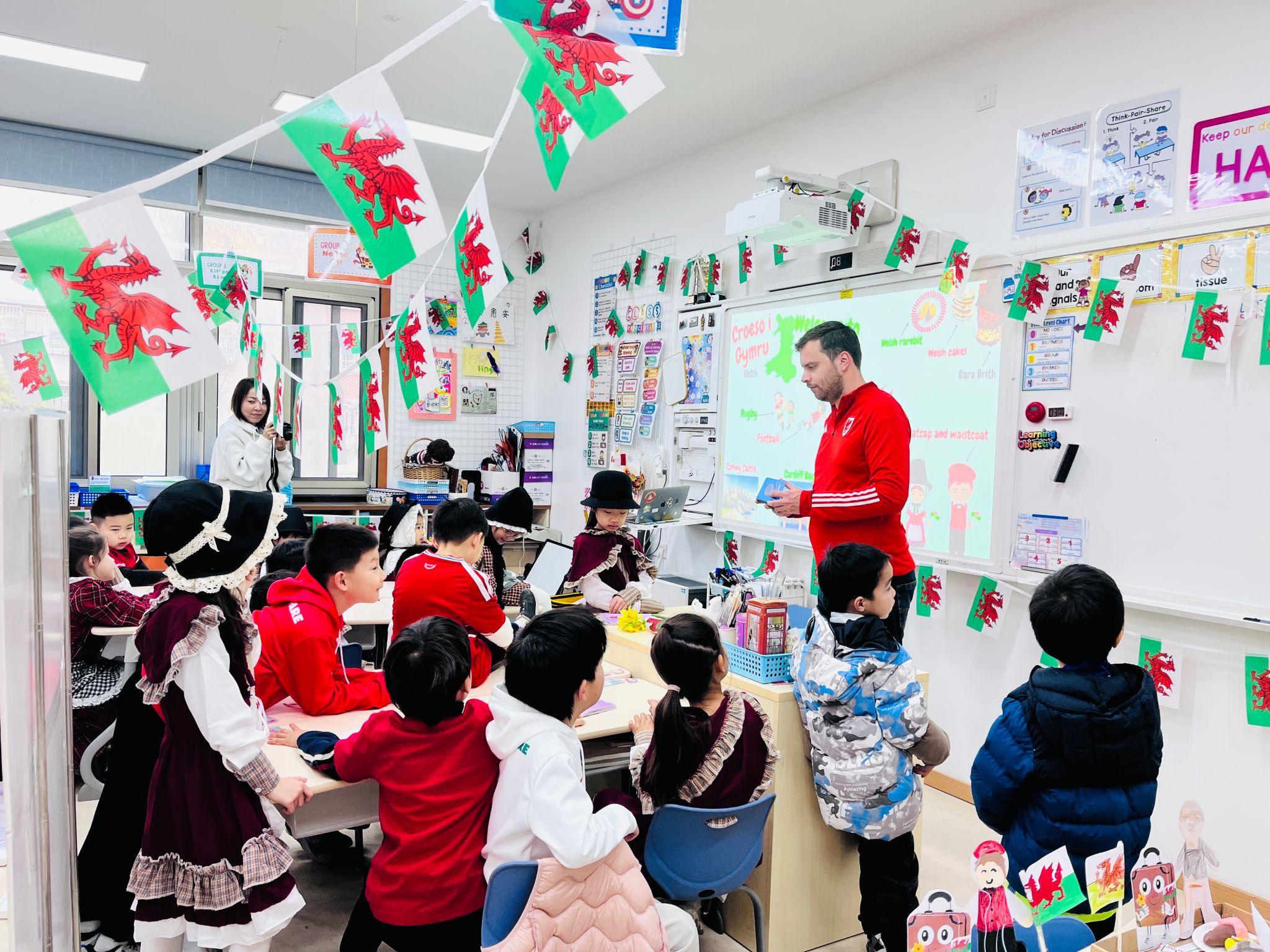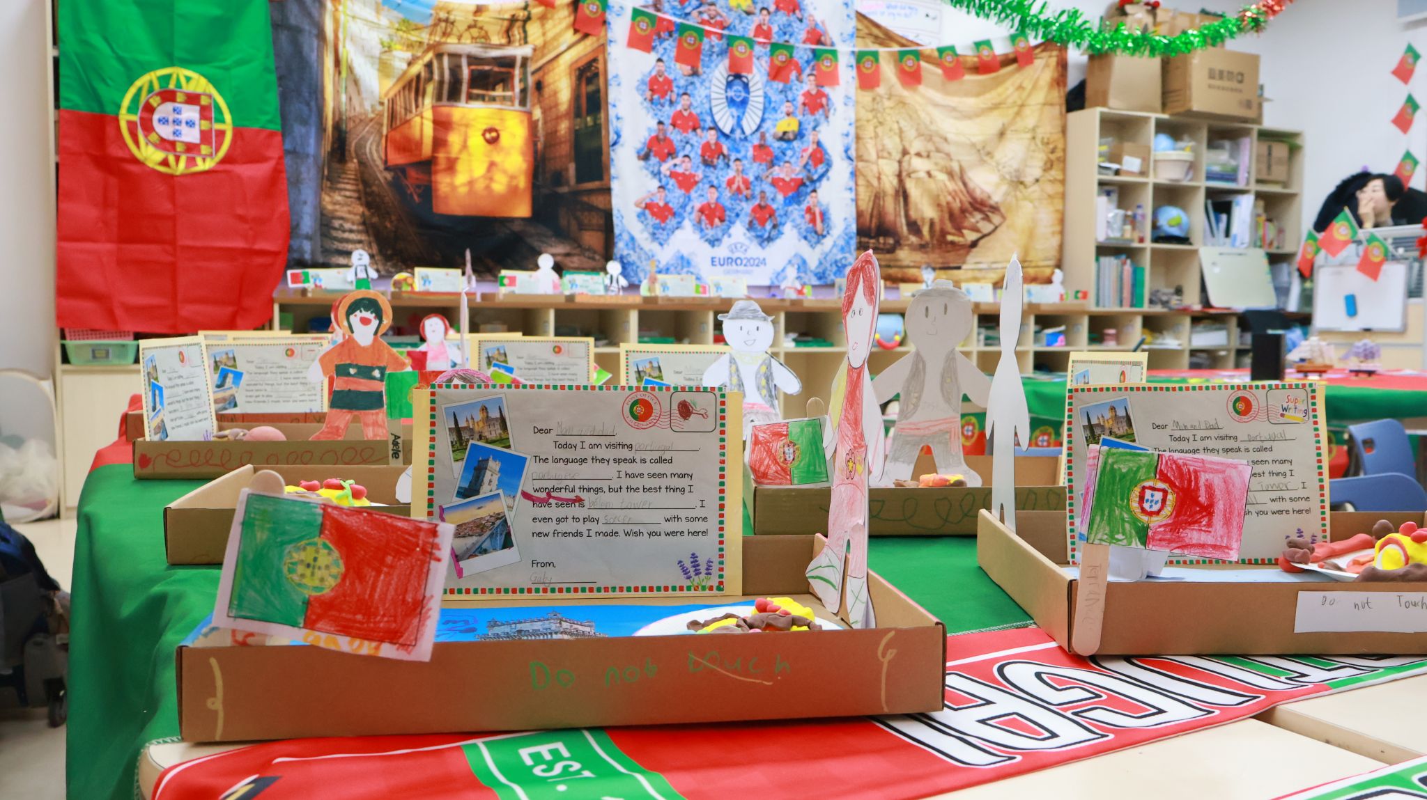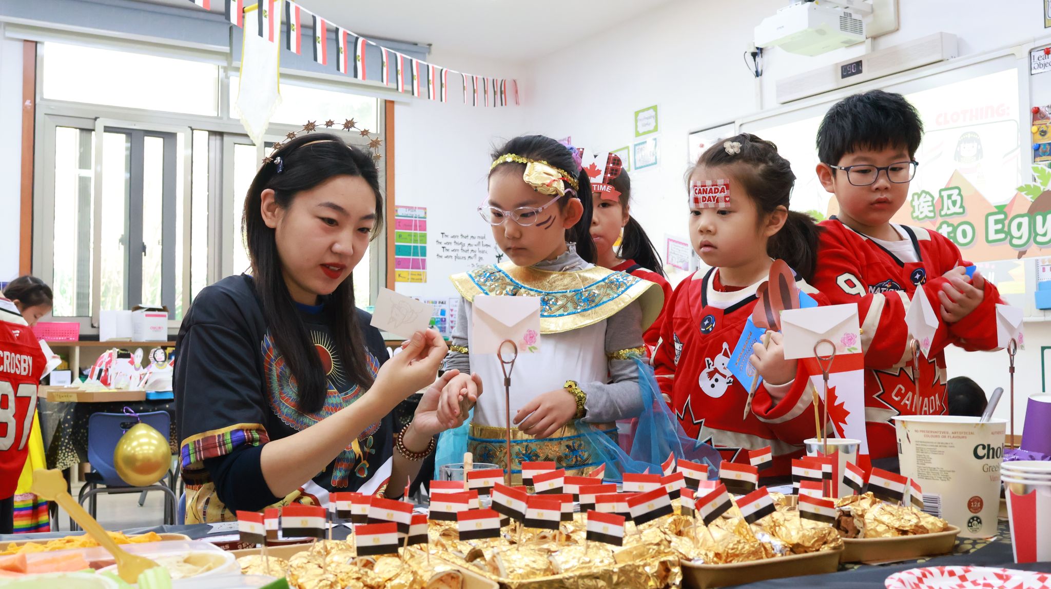 On Puxi campus, students walked around their own first grade hallway to visit a country theme that the other homerooms prepared. On the walls were decorations from their work during the previous weeks in class, flags from their countries, and other cultural symbols. From Europe, the countries were Ireland, Spain, Wales, Portugal and Greece. Africa’s Egypt had some big displays as it’s a popular choice each school year. North America rounded out the last two classrooms, with Canada and Mexico proudly represented.