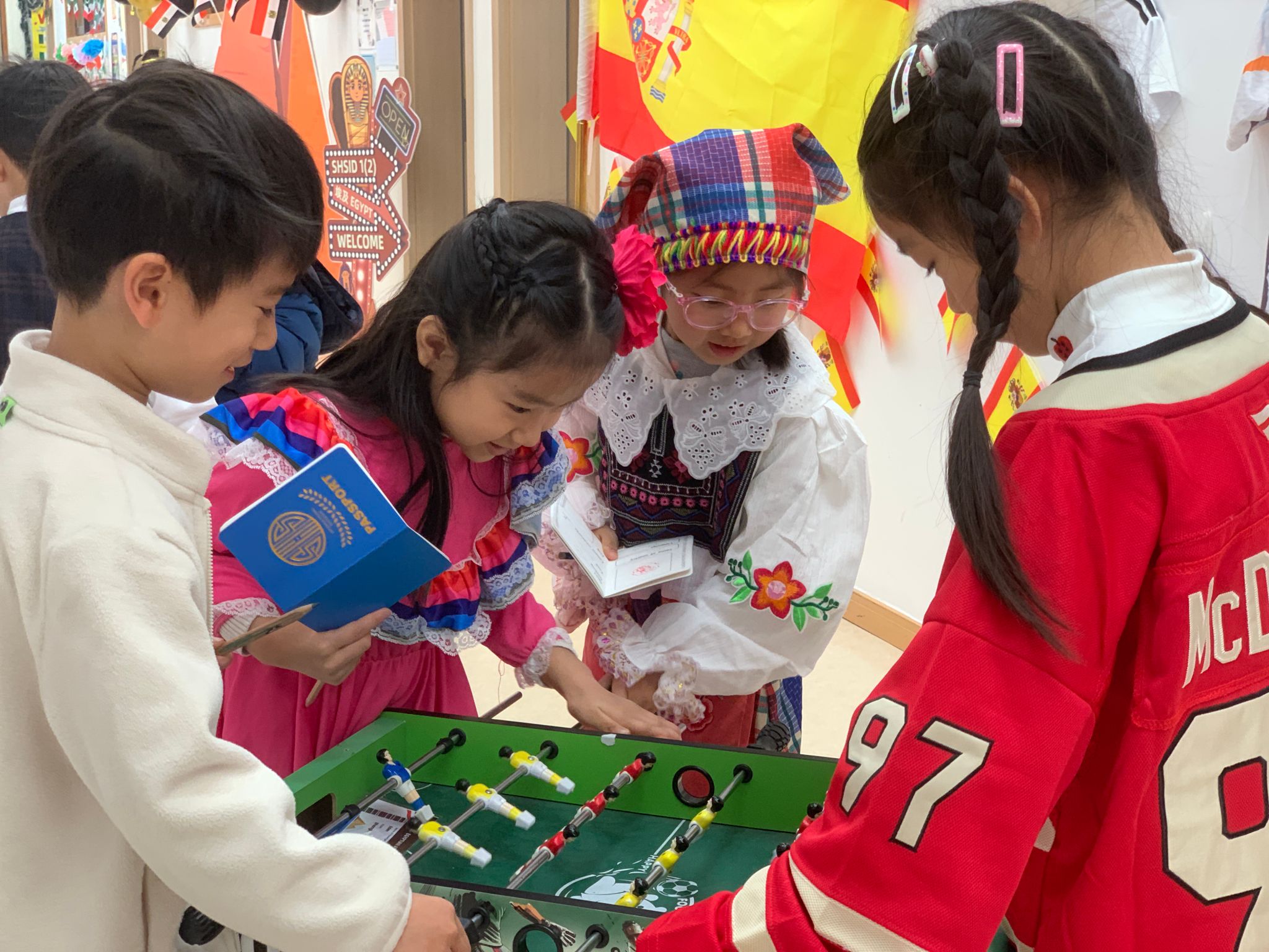 Hongkou campus is in its third year of hosting its own Geo Fair. This year, each homeroom had not one, not two, but five countries represented! Each desk group had parents come to the campus to help prepare a country display poster and table. Students created the poster and parents filled out the rest with snacks, prizes and games. As students explored countries like Thailand and Malaysia, they tried different snacks, like shrimp cakes and coconut juice. The Greece and India tables had games and prizes to be won. France, Morocco and Sweden represented their countries with lovely displays of cultural artifacts. South Africa, Mexico and the Brazil tables were not only educational, but very colorful.