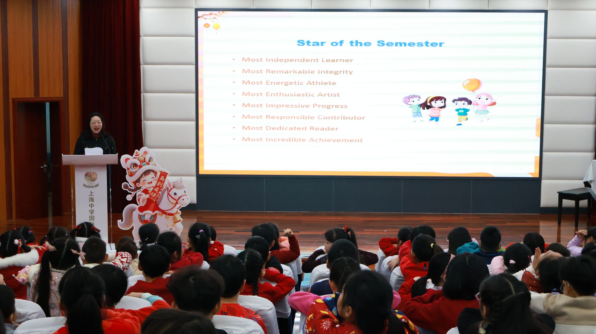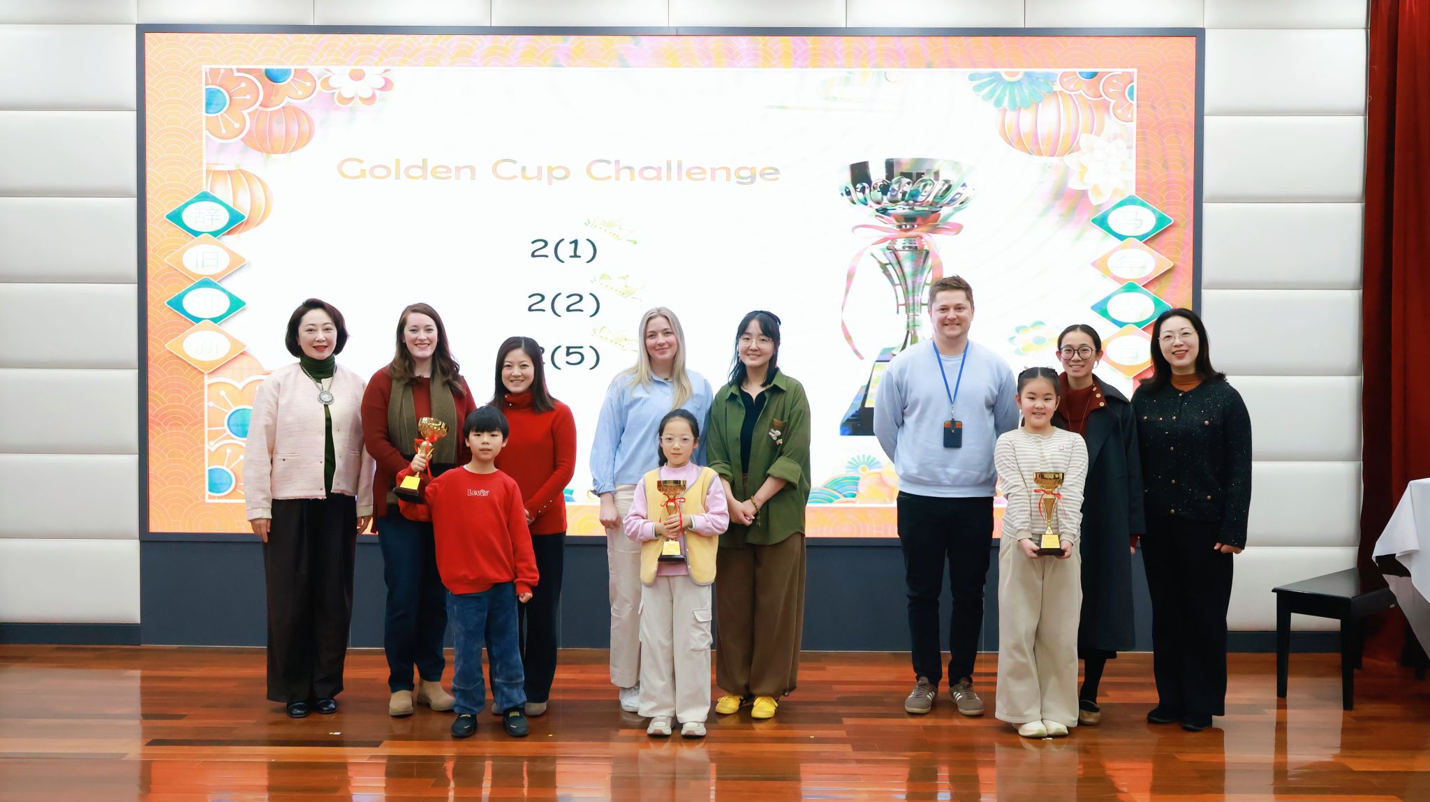 During the awards segment, homeroom teachers announced the "Eight Stars" winners from the previous semester, recognizing students who excelled in various areas. Ms. Liu Fang and Ms. Miao Xiaoling, Assistant Principal of SHSID Middle and Primary School, then presented trophies to the classes receiving the "Golden Cup Challenge" Excellent Class honor and took group photos with the class representatives, inspiring all classes to strive for greater achievements in the new term.