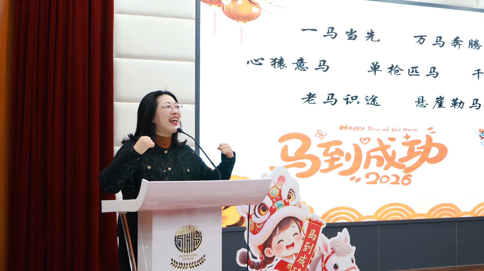 Finally, Ms. Zhang Yi delivered her new semester blessings in a creative and heartfelt way, using Chinese idioms featuring the word "horse" (马). She encouraged students to "take the lead" (一马当先) in their studies, avoid being "distracted" (心猿意马) in class, and bravely face challenges knowing they have the support of "thousands of troops" (千军万马)— their teachers, classmates, and parents. She also hoped that returning students, like "an old horse knows the way" (老马识途), would help new students adapt to campus life. She wished everyone "immediate success" (马到成功) in the new semester, gaining knowledge and friendship along the way.