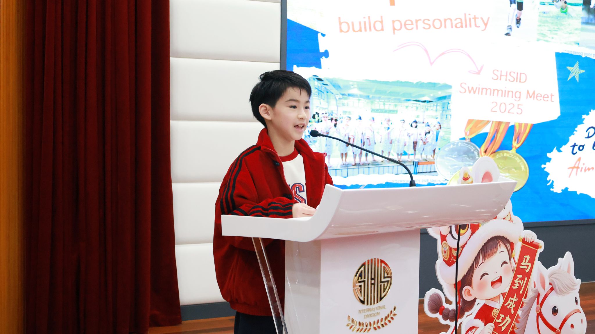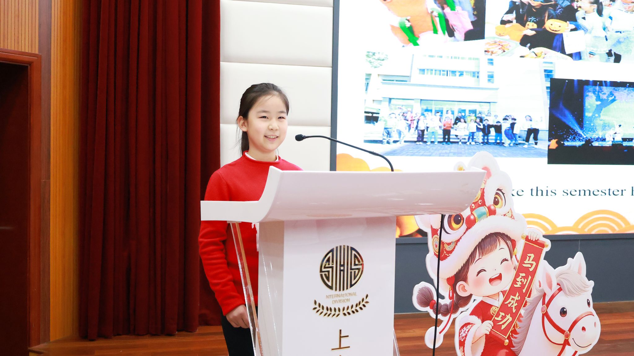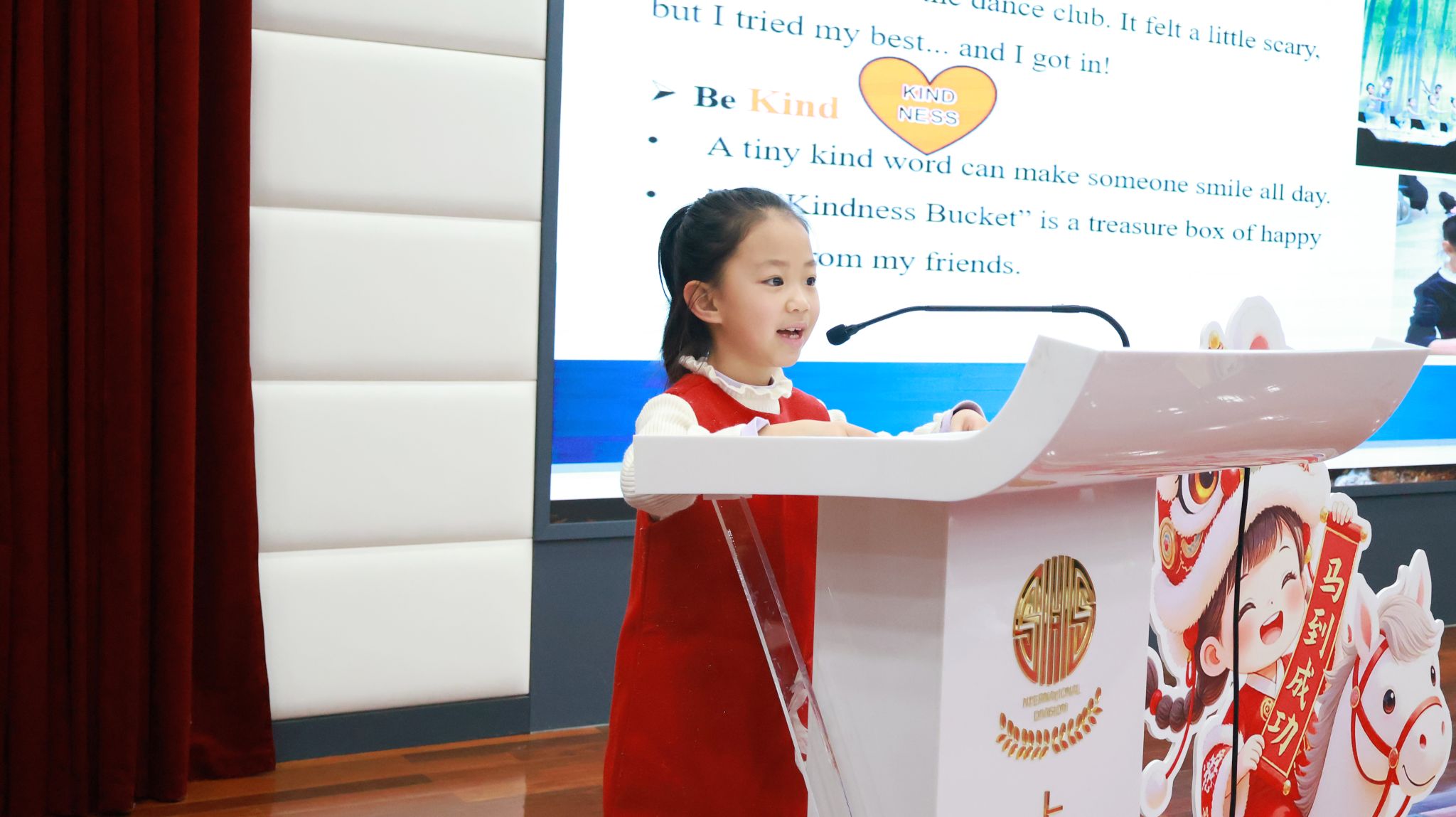 Three student representatives then took the stage to deliver their speeches. Katherine from Class 3-2 shared her "four goals for the new semester," encouraging her fellow students to remain curious in Chinese, math, and science classes, to explore bravely, to persevere, and to grow into bright, confident, and respectful students. Elena from Class 1-1 shared her growth story at school with sincere and heartfelt words, describing how she learned to be her own "little master," bravely follow her heart, and spread kindness in daily life. Oswald from Class 2-6 delivered a humorous and confident speech, reflecting on his achievements in sports, academics, and teamwork. He inspired his peers with the quote, "Don't aim to be the best. Aim to be the only," encouraging everyone to become their unique selves, earning rounds of applause from the audience.