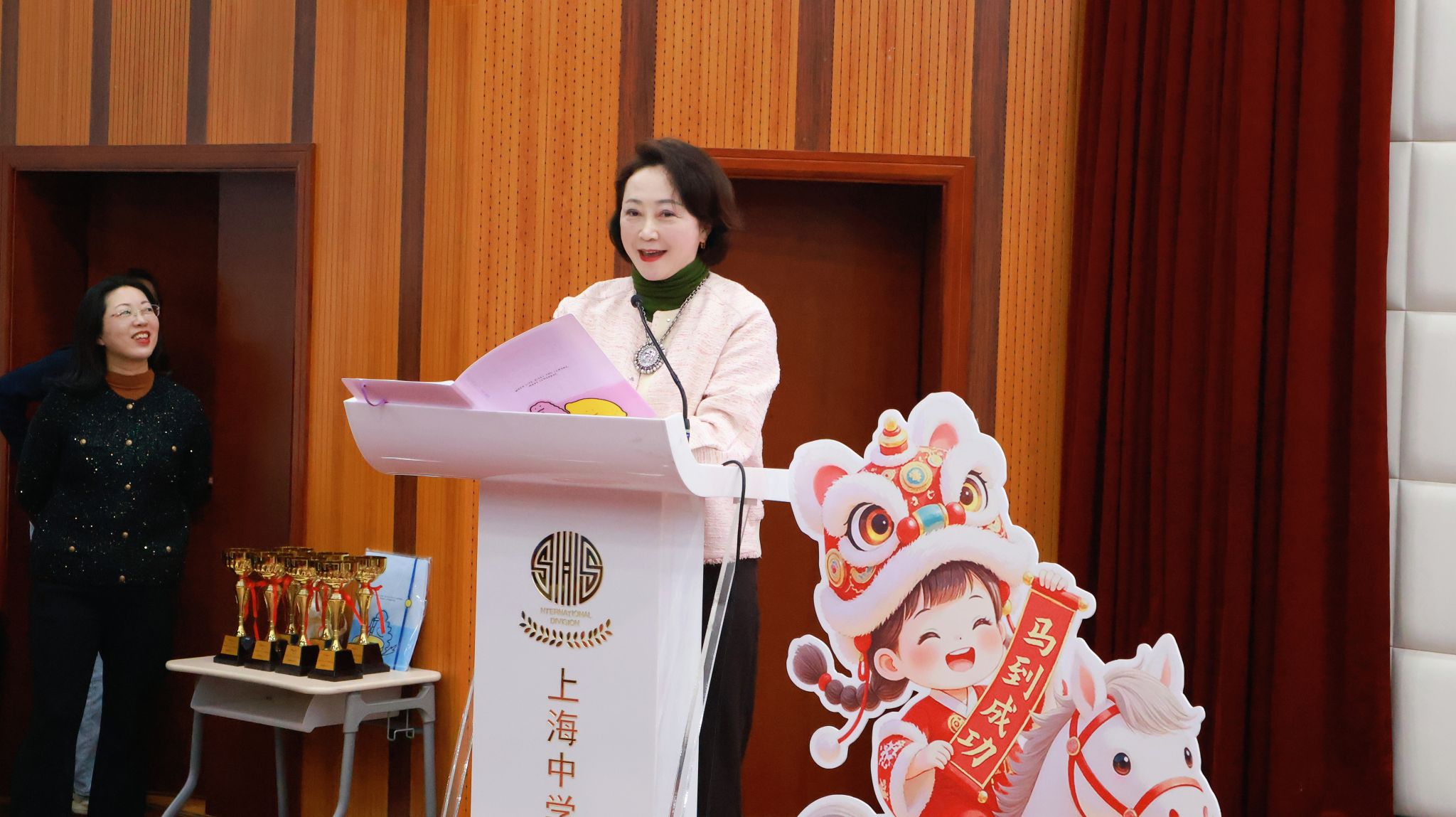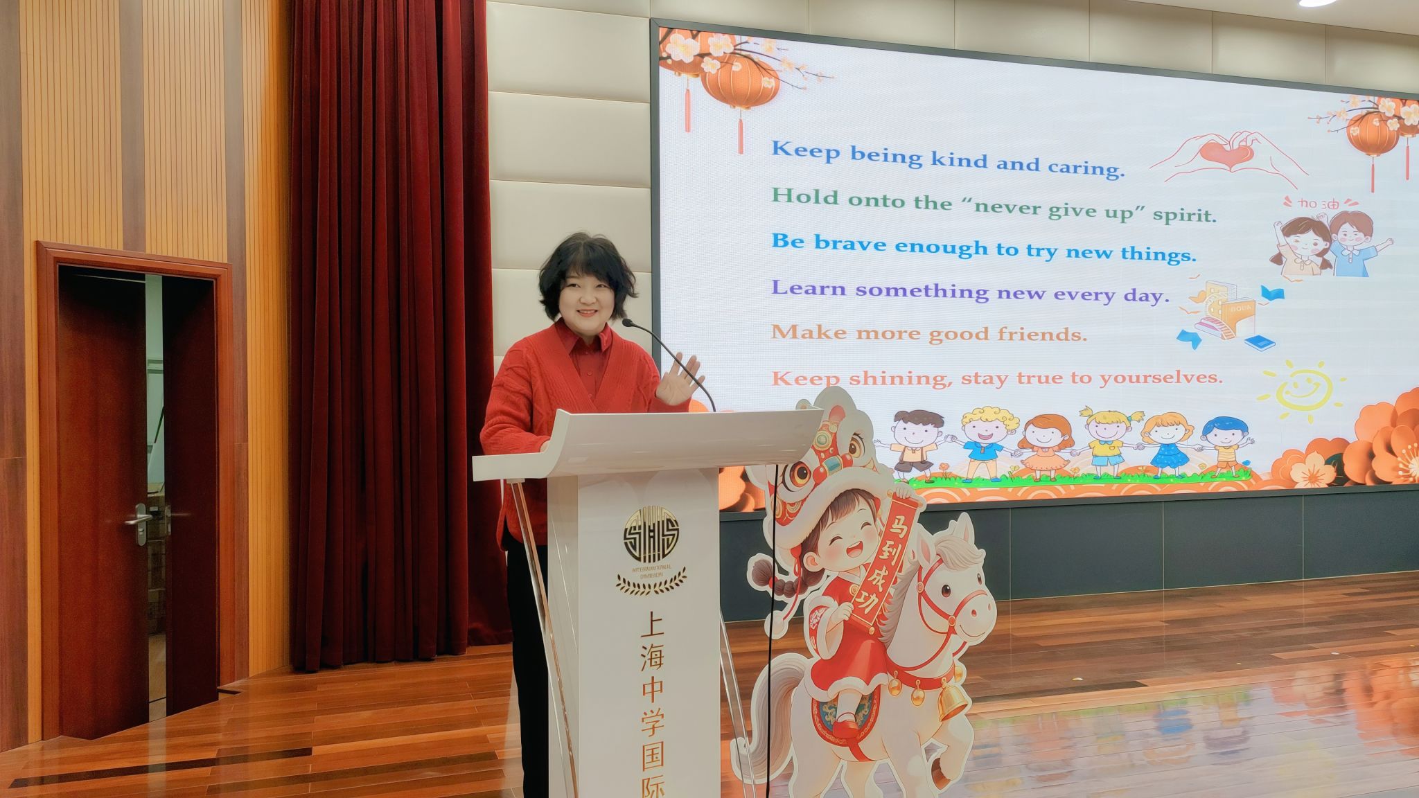 Following the video, Ms. Liu Fang, Vice Principal of SHSID Middle and Primary School, delivered her new semester address. Centered on the themes of "courage, perseverance, kindness, and joy," she encouraged students to embrace new challenges, never give up when facing difficulties, and warm others with kindness. She hoped every student would grow and find joy in the new semester, becoming the brightest stars on campus.