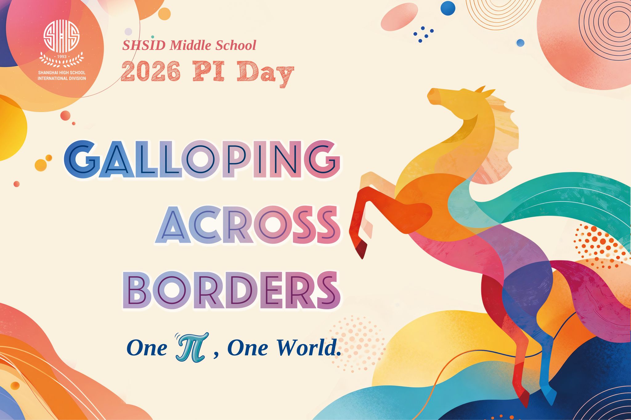 On the afternoon of March 12, 2026, the annual Middle School Pi Day celebration was successfully held in the Hsi Building. Students and teachers from Grades 6 to 8 gathered together to experience the unique charm of mathematics through a variety of engaging and challenging activities. This year's theme, Galloping Across Borders— One π, One World, symbolized how mathematics can serve as a bridge connecting people and ideas across the world.