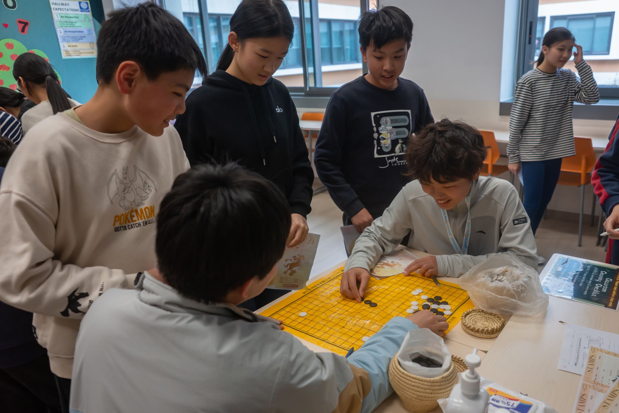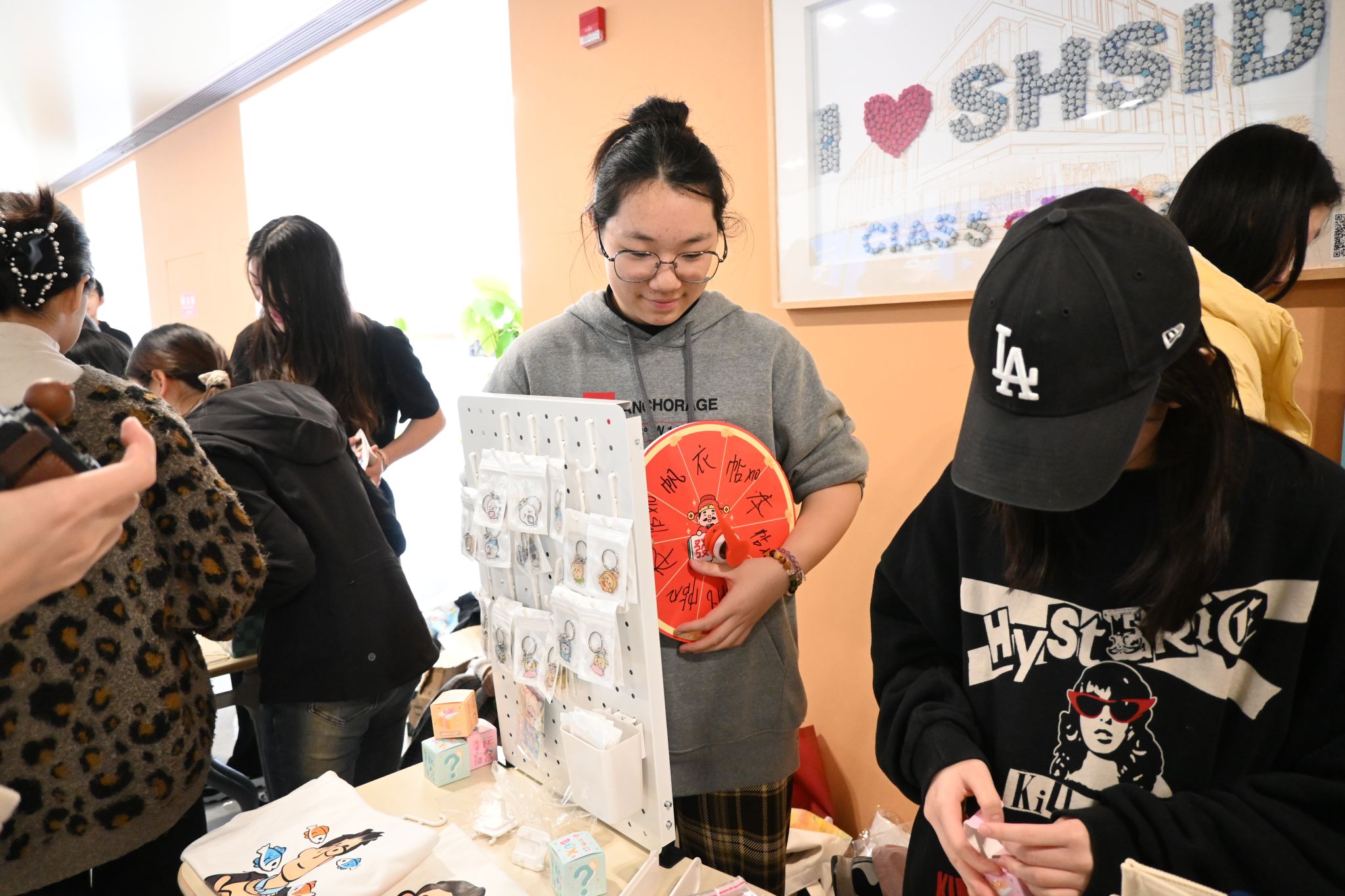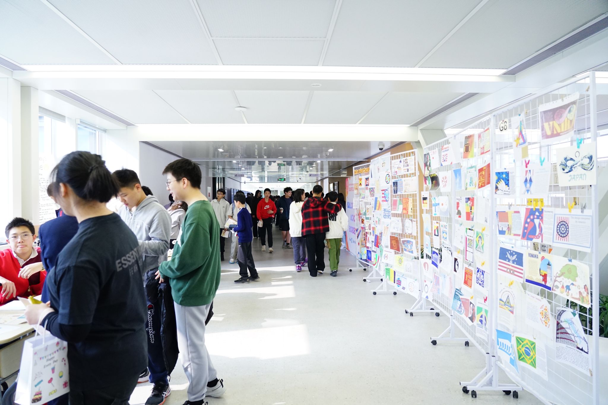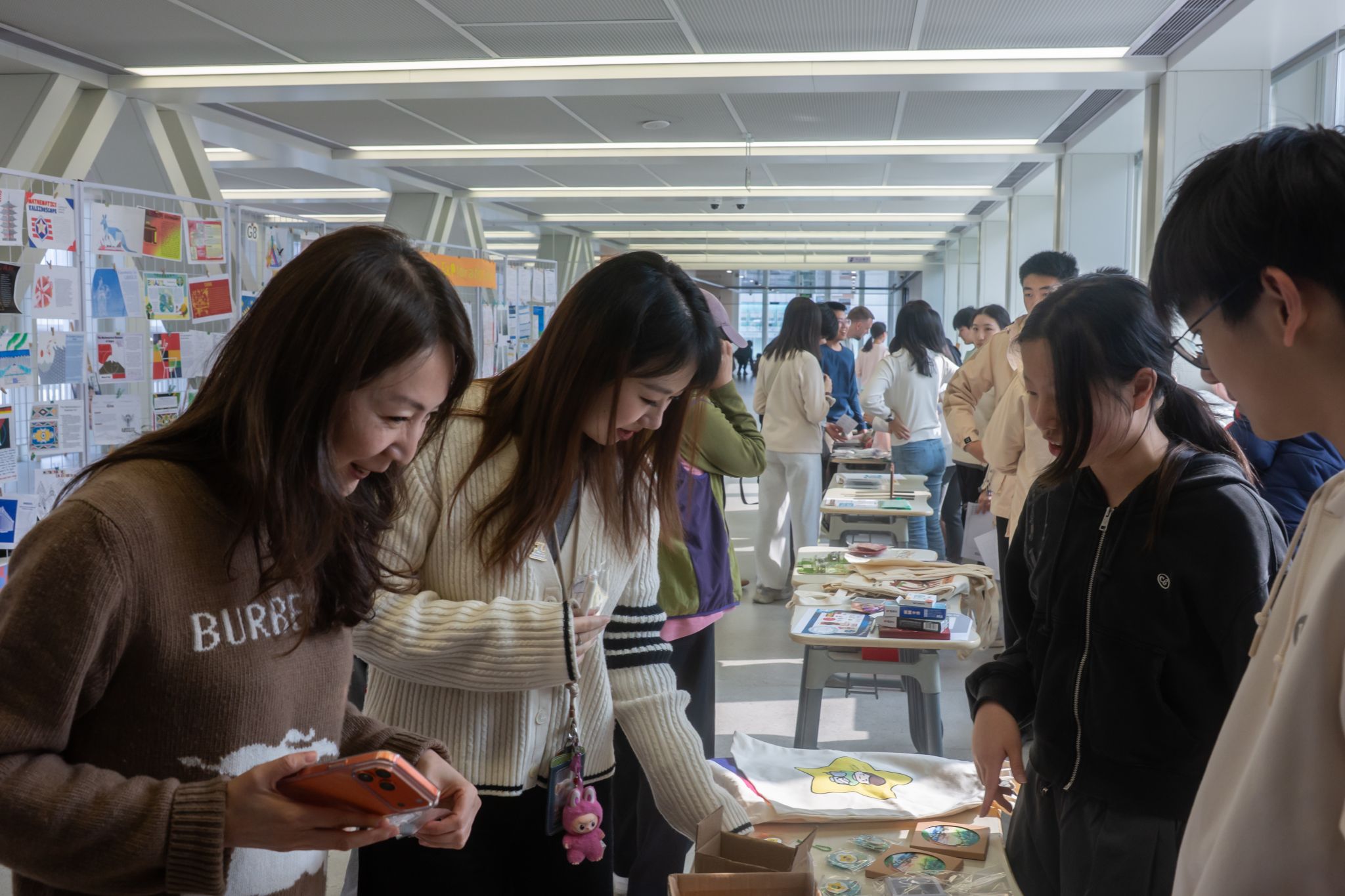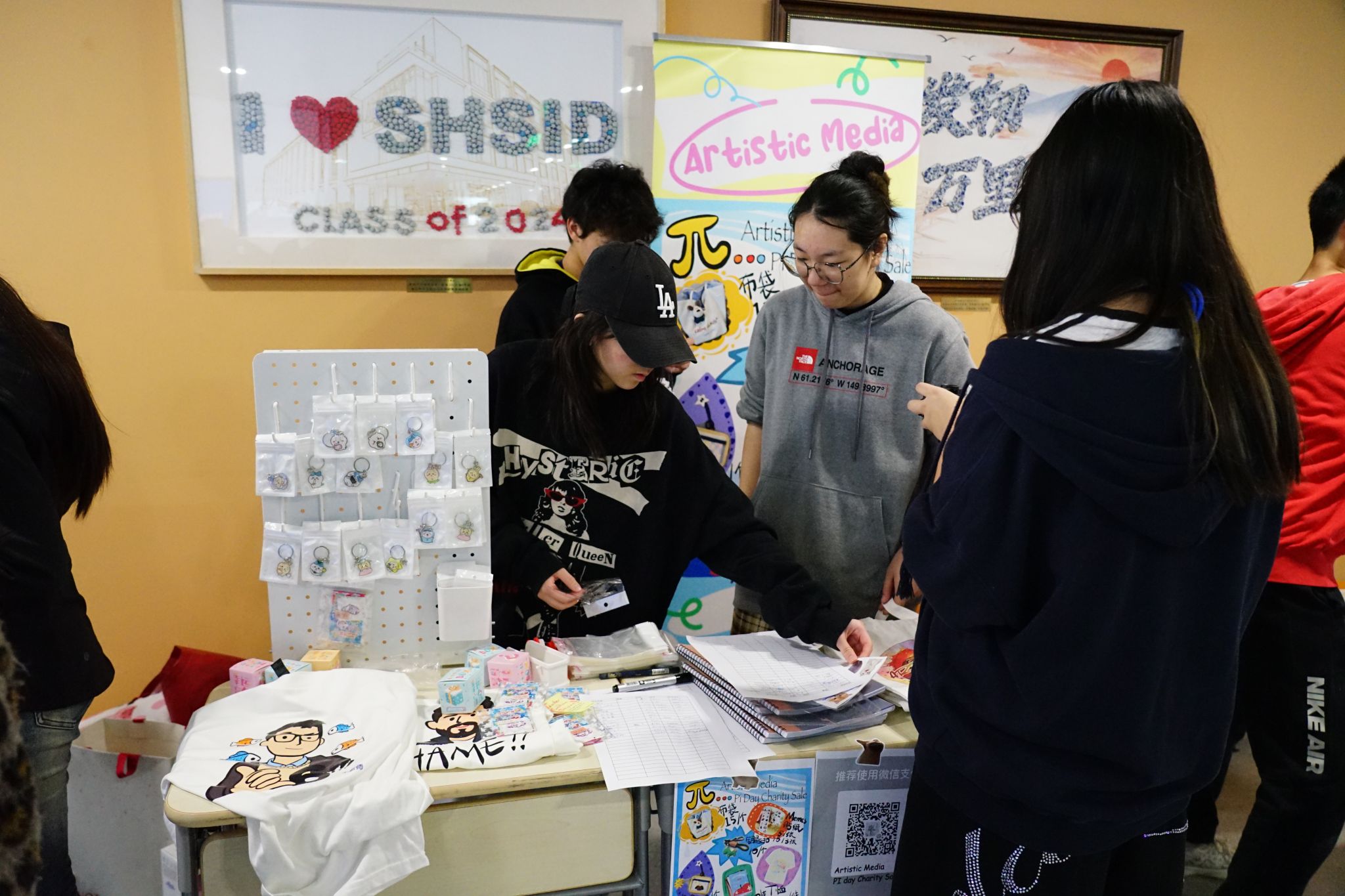 While the math activities were in full swing, a lively charity sale was also taking place in the Hsi Building corridor. This year's Pi Day charity sale expanded in scale, with 11 Grade 8 Service Learning groups participating and offering creative products related to their project themes.