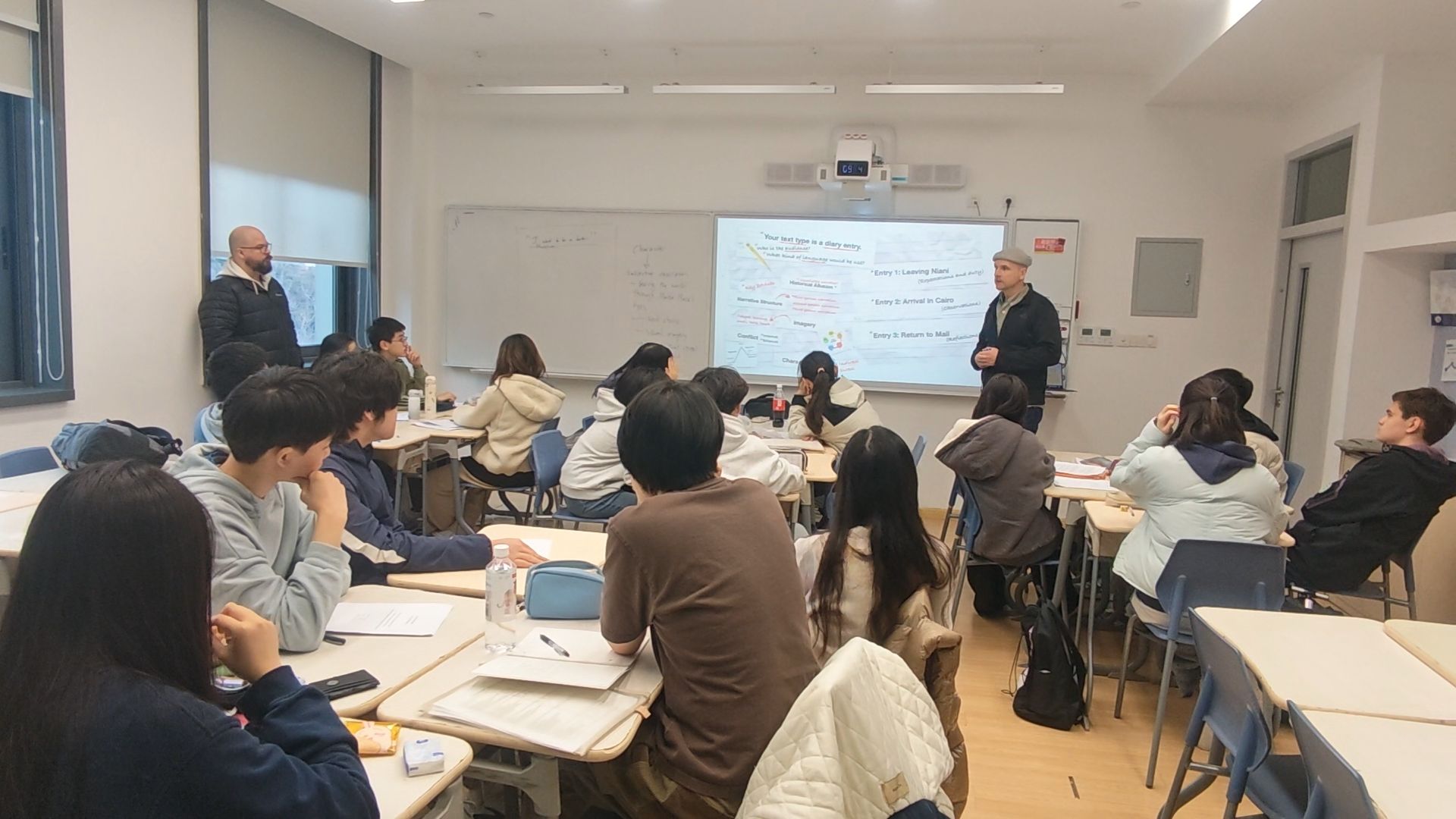 Mr. Paul Roberts and Mr. Justin Way from the English Department clearly addressed each of these questions one by one. They began by using literary works based on historical events—such as Maus and Of Mice and Men—that students are familiar with or are currently reading, demonstrating that this type of writing is actually not foreign to them, and provided additional reading recommendations. Next, they helped students clarify the concept of a diary by clarifying its audience and language; Subsequently, they offered specific suggestions based on the themes of the three diary entries: for instance, how to establish a setting and related conflicts in the opening entry; how to incorporate “contrastive” descriptions in the latter two entries to highlight changes between stages; and how to effectively use indirect characterization to emphasize a character’s key traits, among other points.