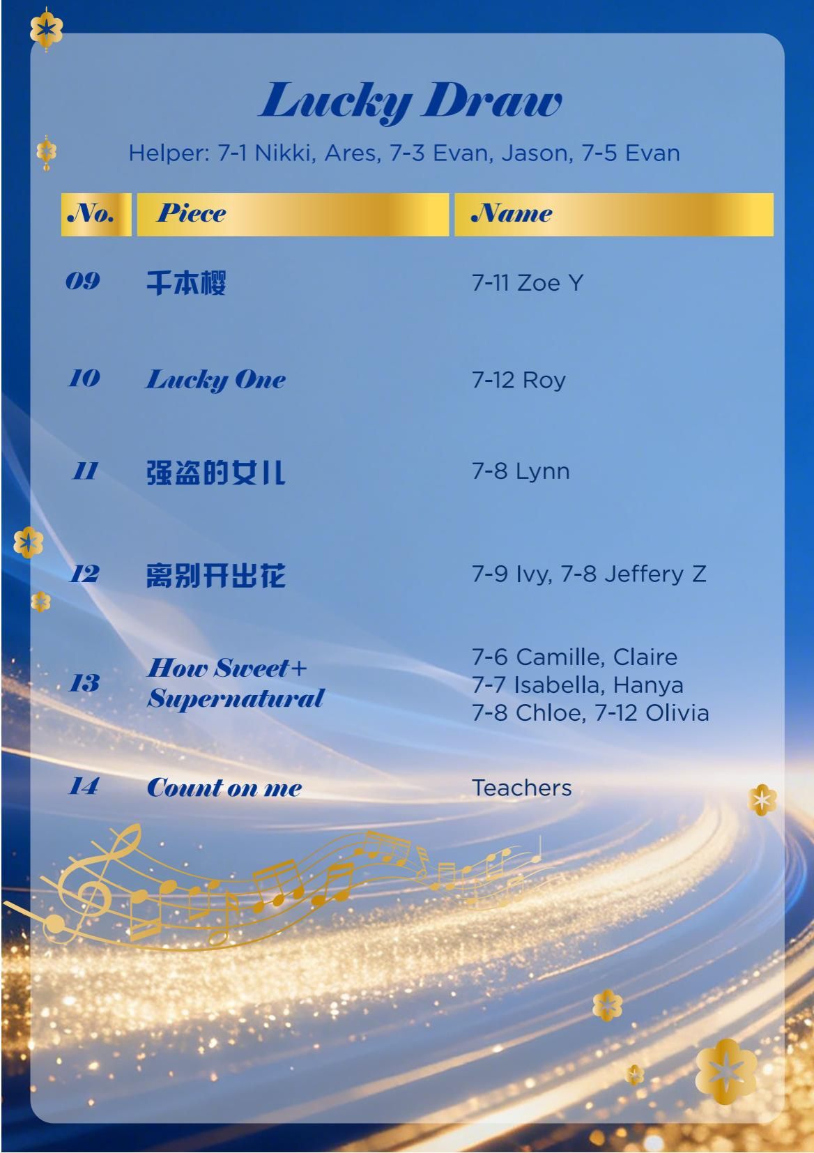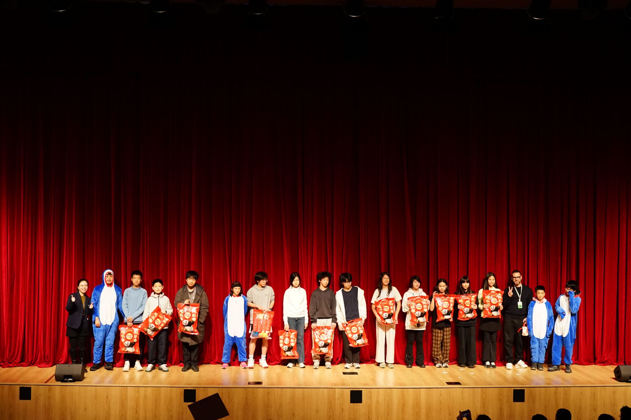Between performances, fun and engaging lucky draw activities kept the audience actively involved, with waves of cheers and excitement filling the hall. Nikki, Ares, Evan J, Vito, and Evan C brought a lively warm-up dance “Baby Shark”. Homeroom teachers from each class then took turns coming on stage to draw the names of their class’s lucky students. Ms. Wu Wenyi, Grade 7 Supervisor and Mr. Wendell, Grade 7 Vice Supervisor drew four lucky classes to receive special prizes.