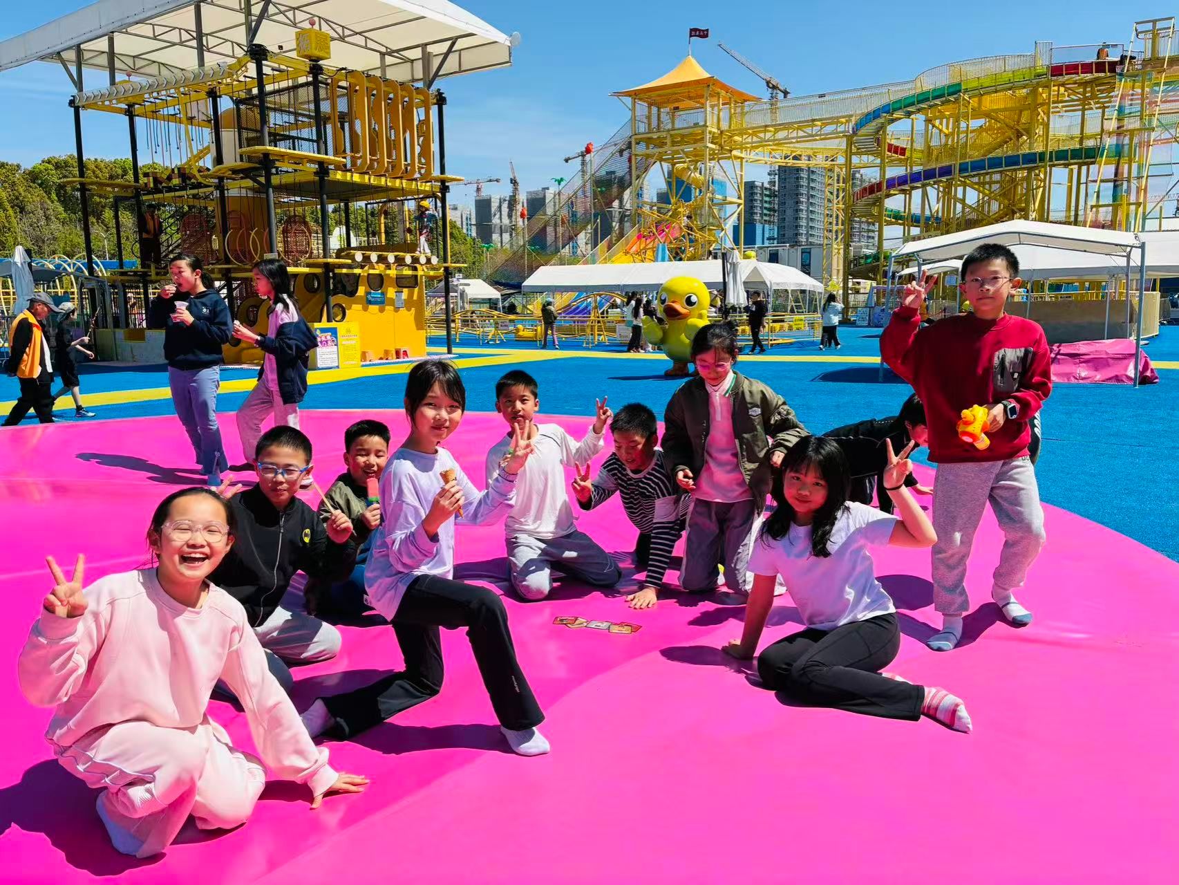 Leaving the fairy-tale flower garden behind, the students arrived at the joyful “Little Yellow Duck Park.” The park offered a wealth of fun-filled activities, with the water slides and rainbow slides proving the most popular. The children raced down the slides, letting the breeze and their laughter carry them as they unleashed their youthful energy. The park also featured several balance-challenge activities, where the students bravely gave them a try and supported one another, building physical strength and gaining courage through each challenge.