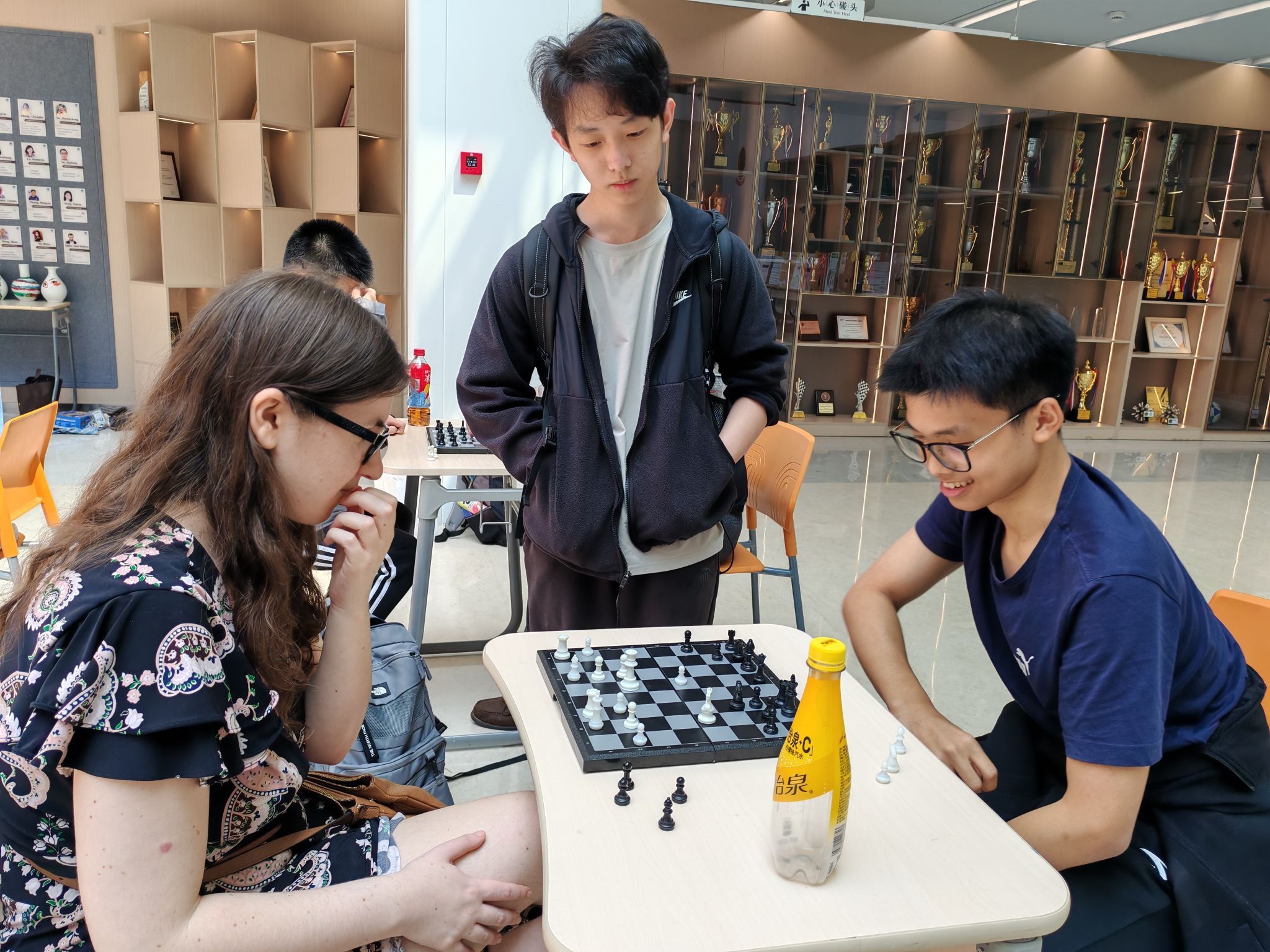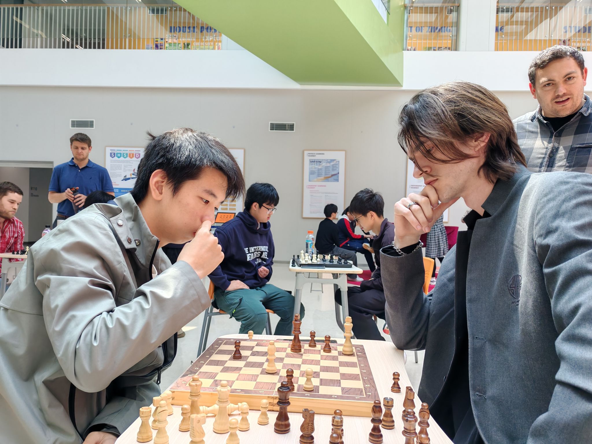 During the event, the B1 Atrium of Zhongxing Building became the most lively spot on campus. More than a hundred students from all grades came to participate or watch—some new to the game, some seasoned players, and others cheering loudly for their friends. On Friday, the Student-Teacher Friendly Match lifted the atmosphere to new heights. Several teachers passionate about chess joined the games, playing side by side with students. The friendly competition gently bridged the distance between teachers and students, blending warmth and sportsmanship.