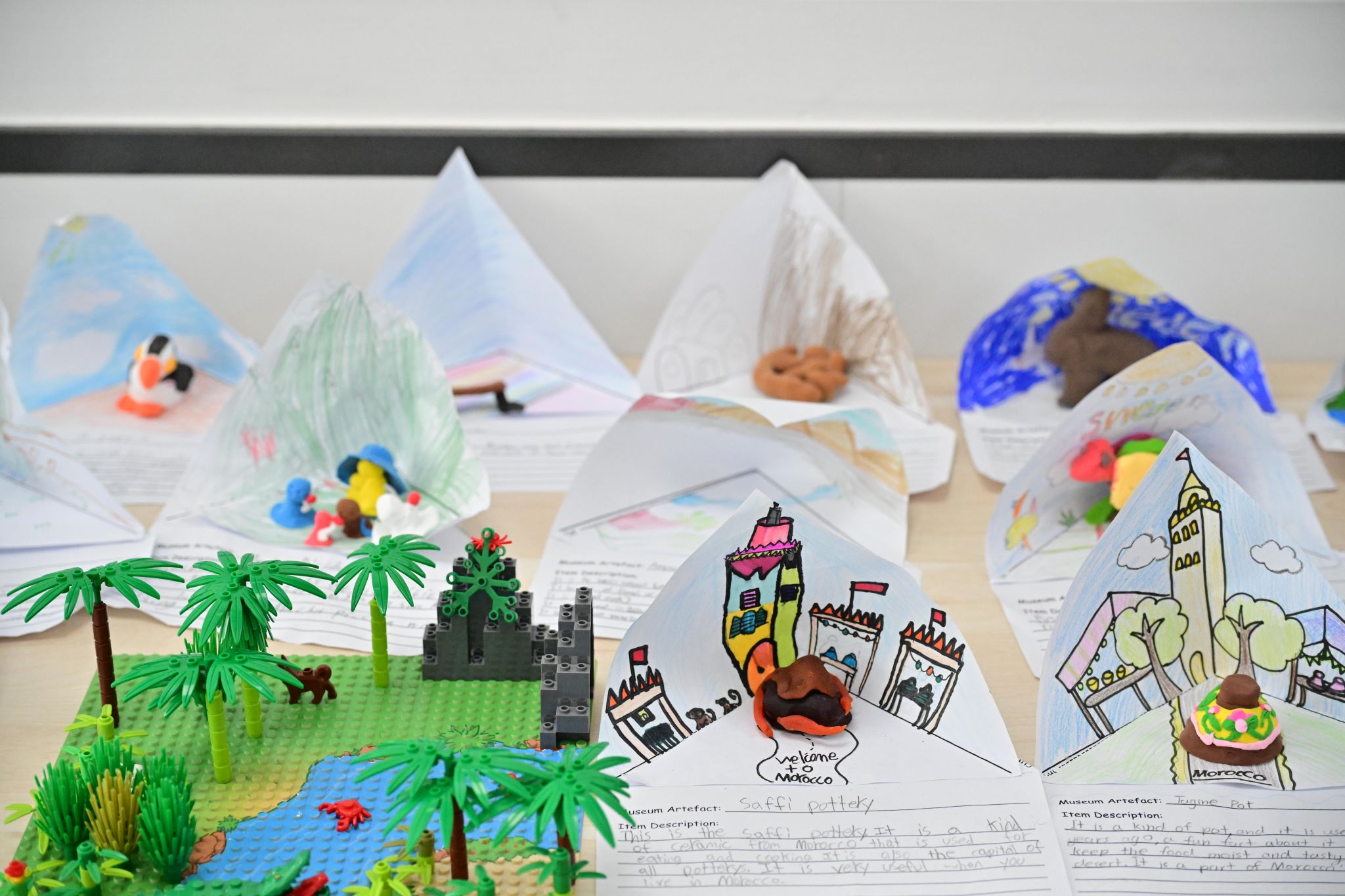 Meanwhile, Grade 2 students explored their countries through creative triaramas, showcasing important artifacts and cultural elements by building models and designing backdrops to help share their knowledge of the countries they were representing. Class 2-1 created a bounty of beautiful artifacts to show from Australia, Peru, and Iceland, while Class 2-2 produced poignant portrayals of Russian, Swedish, and Moroccan artifacts.