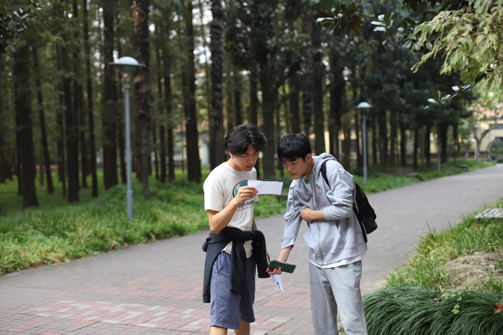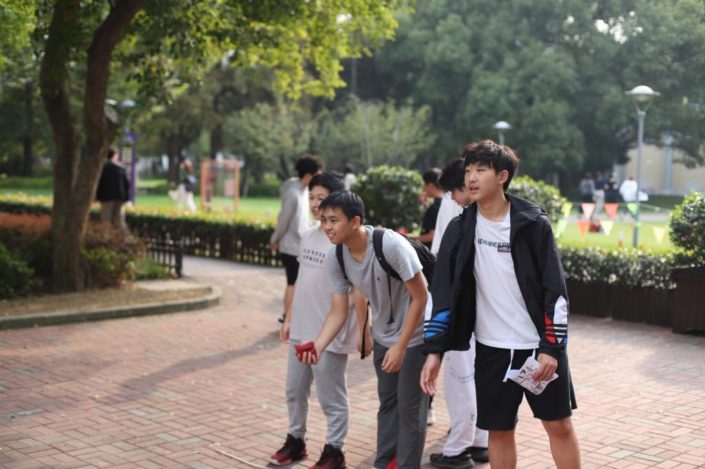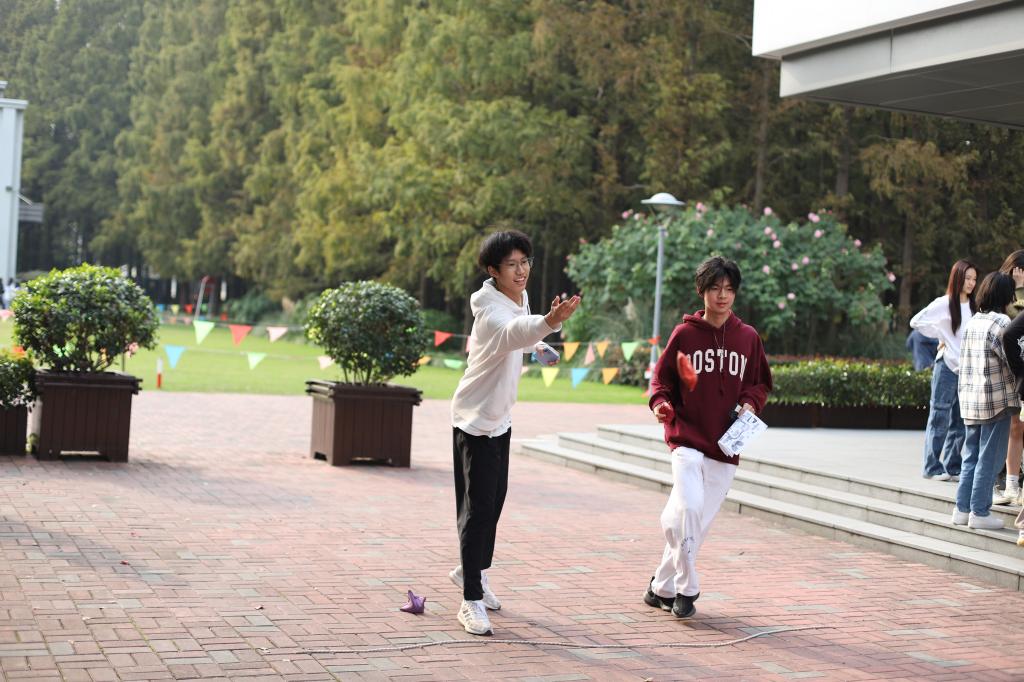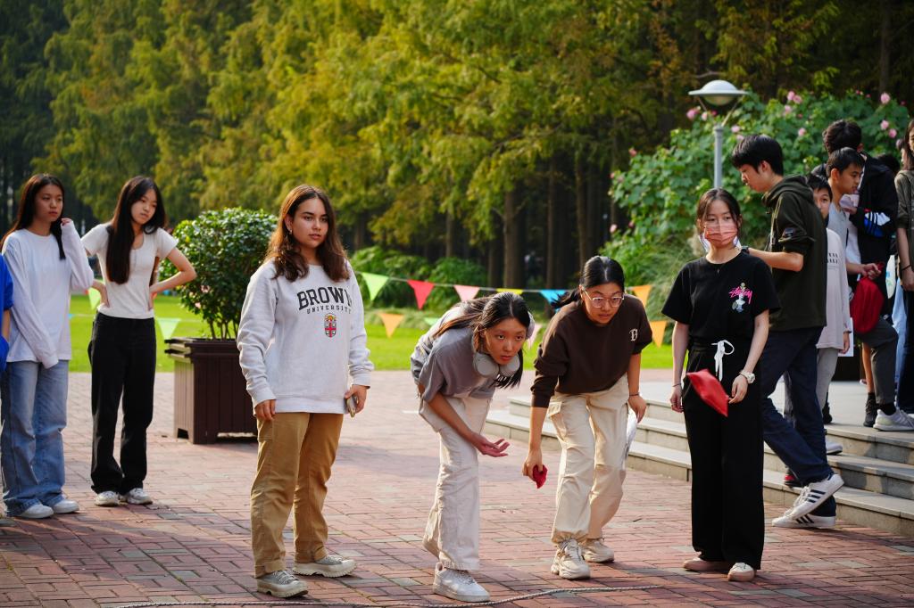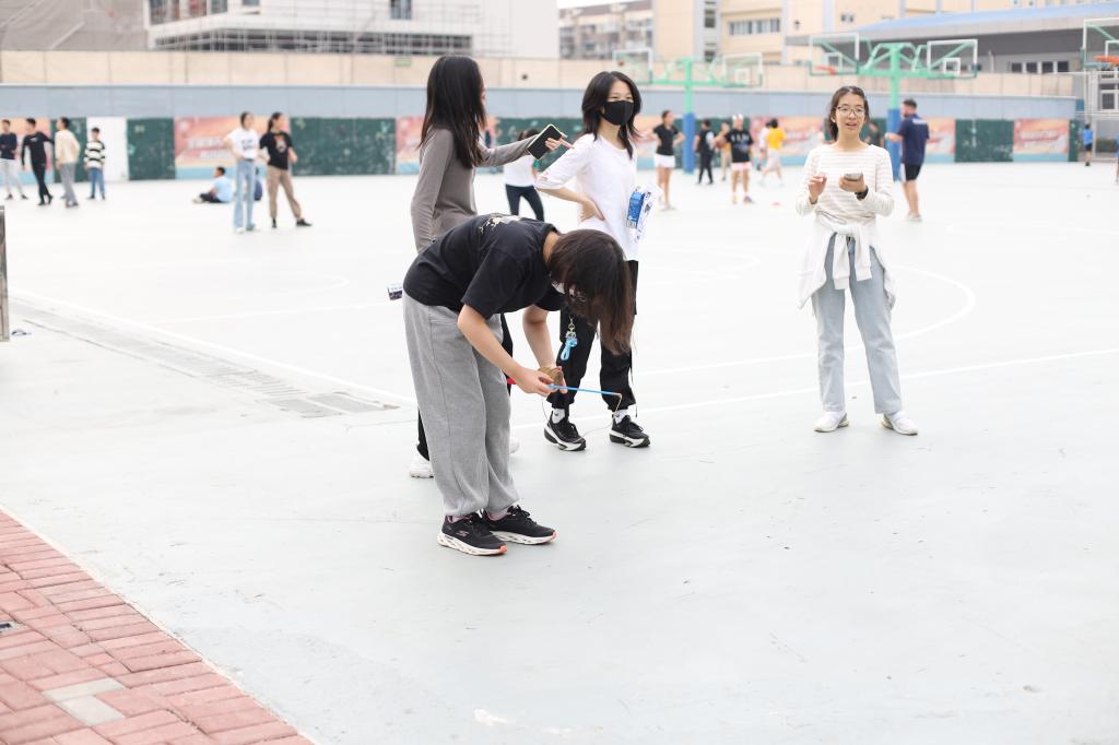 Excited and chattering about, the students quickly dispersed throughout the campus along with their teammates. Their first task took place in an Xianmian classroom, where they answered Chinese questions and tested their accuracy with darts. The students exchanged satisfied glances after obtaining their initial stamps. Next, near the Lawson store, students engaged in shuttlecock kicking and tackled STEM-related questions. While many struggled with the shuttlecock, they triumphed through perseverance and teamwork. The third stop was at the outdoor basketball court, combining English questions with the challenge of pumping a wooden gyro. Outside the school cafeteria, at the fourth stop, students faced humanities questions while participating in jump-rope activities. The final challenge, outside Zhentao Building, involved math questions and tossing three sacks into a circle.