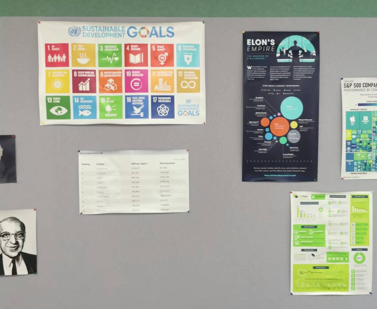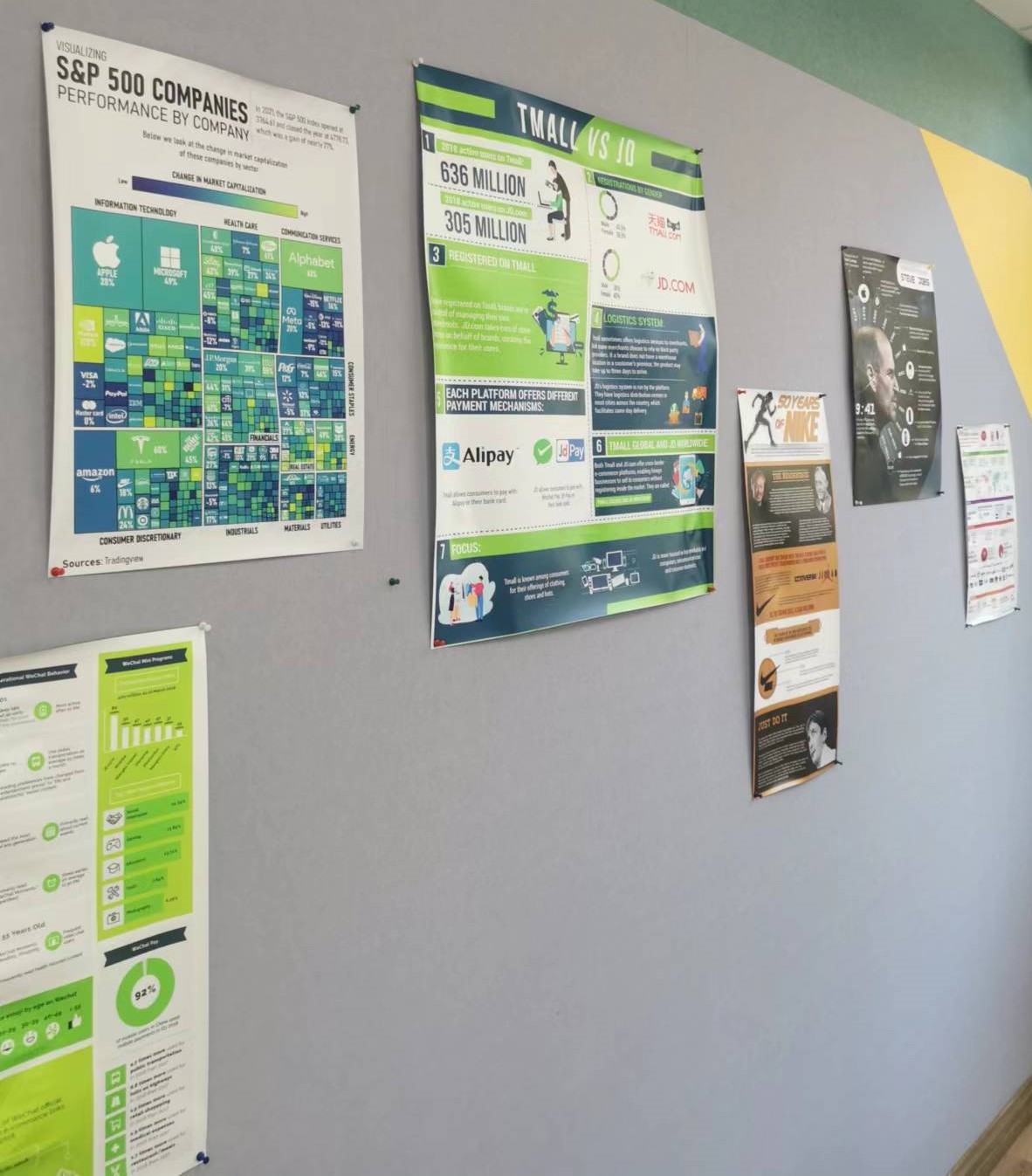 These posters are rich in content and creative in design, and the themes involve economics, business, psychology, law, etc. Among them, some summarize the sustainable development goals of the United Nations, some compare the business indicators of Tmall and JD.com, some vividly demonstrate the reason why human society needs laws, and many incisive remarks by famous scholars. The poster wall has attracted many students and teachers who use the classroom. They stopped to watch, lamenting the ingenuity and passion of the students, and also saw the richness of the course content in the Social Science Department.