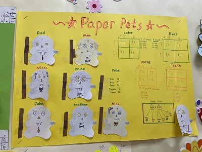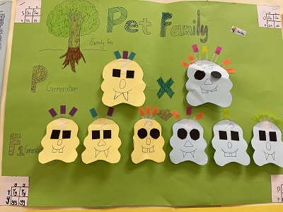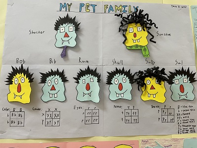 Recently, the students of 6th grade have been learning about genetics in their science classes. Concerning the students to further understand this topic, the teachers came up with an idea for a paper pet project. The pet contained five features including, eyes, nose, gender, skin color, and teeth. After creating the F1 generation, students used Punnett squares to illustrate the percentage of possible traits for their offspring. On June 9th, 6th-grade science students exhibited their projects. They had shown extraordinary imagination and creativity. Some gave not only the features but also even clothes for their offsprings. Other students created a large poster showing all the details of the project. These beautiful works reflected the depth to which students had mastered this unit in genetics. These 6th graders rock!