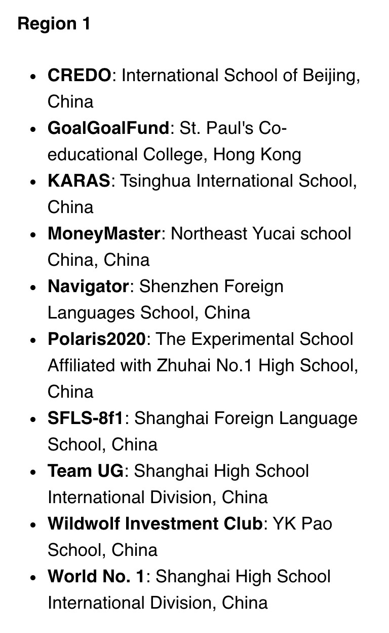 The Wharton Global High School Investment Competition is organized by the Wharton Business School of the University of Pennsylvania, open to all high-school students all over the world. Each year, the competition starts from October and lasts for about 3 months. Students need to conduct stock transactions on a virtual stock market and, more importantly, finish an analysis report based on the demands of a virtual client. On January 18th, 2021, the regional round results of the competition were announced. Two teams from SHSID composed of Grade 10-11 students got into the top 10 teams of Region 1. There were over 900 teams from 35 countries who submitted their regional-round competition reports this year. All teams were divided into 4 regions based on their geographic locations. Only 10 teams from each region could break into the next level. Congratulations to the two teams. We hope they will achieve good results during the finals round of competition!