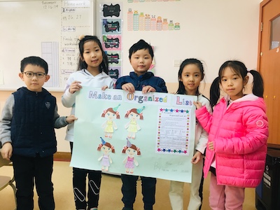 The first graders are working on making organized lists, so the math teachers in grade one designed a math project calledMake an Organized List. Working with their teams, the students had to make a poster. The posters displayed an organized list of the outfits of a girl called Sonia or a boy called Doudou. Sonia has two dresses and two birthday hats to choose from and Doudou has two T-shirts and two caps to choose from. The students needed to decide all of their outfit probabilities and paste all of them on the poster paper. They needed to finish a chart to list all the probabilities. All the students were working as a team efficiently and cooperatively. Most of the teams finished the task correctly and on time.