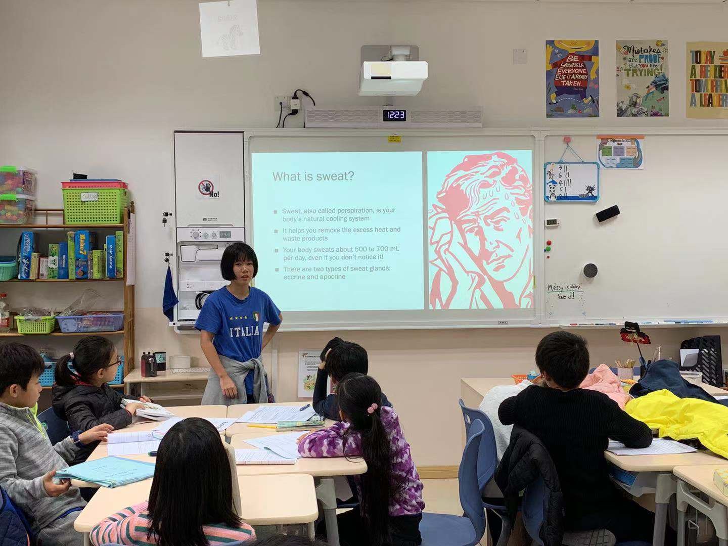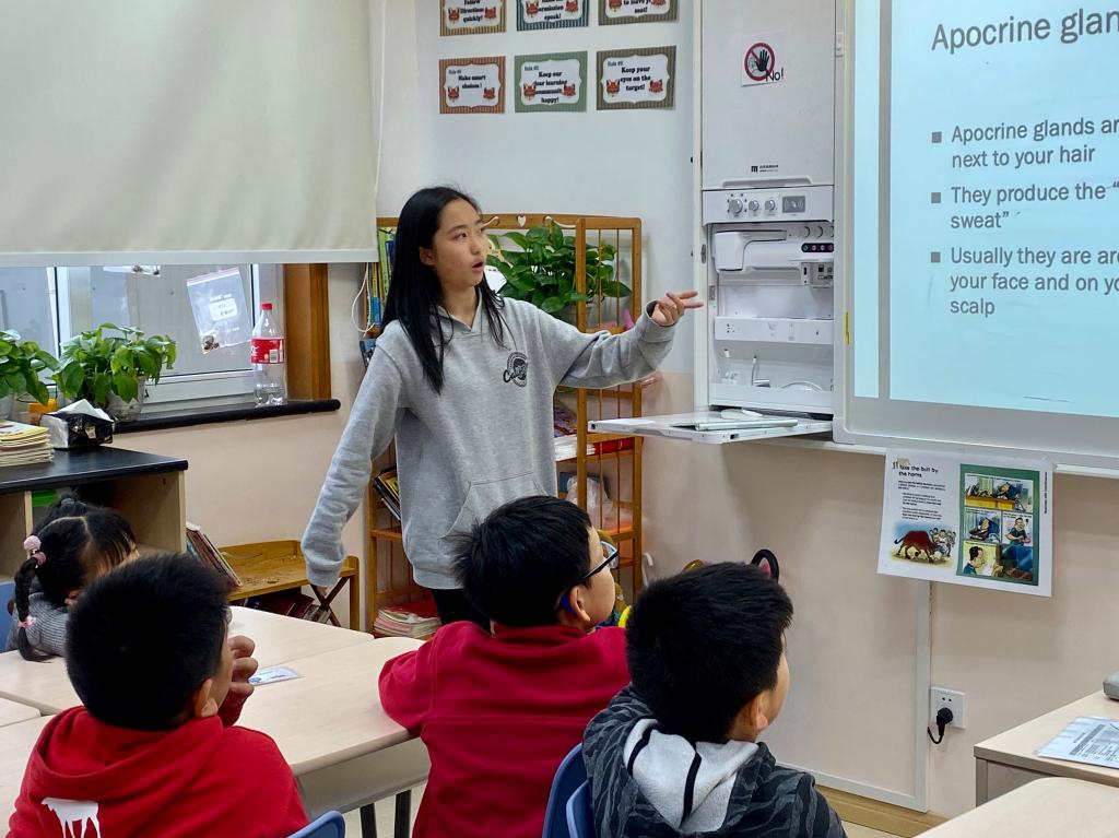 During recess time on November 25thto 29th, Grade 3 got to listen to a very well-prepared Science Talk from Grade 8. The Science Talk was about a closely related topic in our daily life: sweat and urine. When the first slide popped up, some kids burst out in laughter, some whispered to discuss, and some showed very serious and curious looks. Undoubtedly, this topic aroused the attention of all students.
