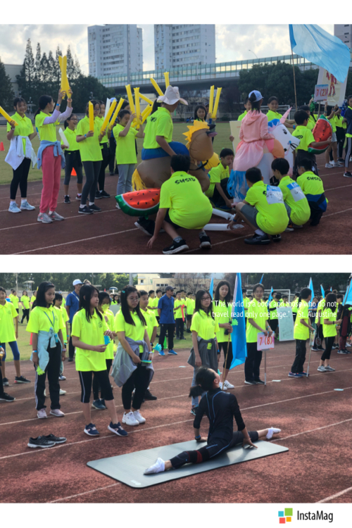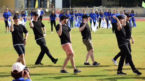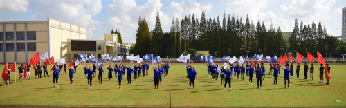 Next came speeches by the student representative, the principal, and the director. Principal Liu and Director Shen gave energetic speeches that boosted our confidence. It was then time for the teachers’ performance. Both male and female teachers performed extraordinarily in front of all the students. Instead of being the serious and responsible leaders in the classrooms, they turned into amazing dancers. The male teachers vigorously waved red flags while the female teachers waved blue and white flags in a uniform manner, which combined strength with elegance. The dances of the Chinese and foreign teachers blended Eastern and Western cultures, fully embodying classical and modern. The wonderful flagship performances of the teachers fully demonstrated the spirit of fighting tenaciously.