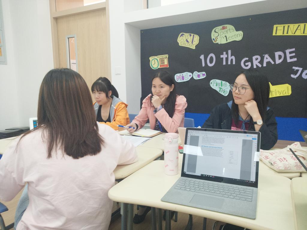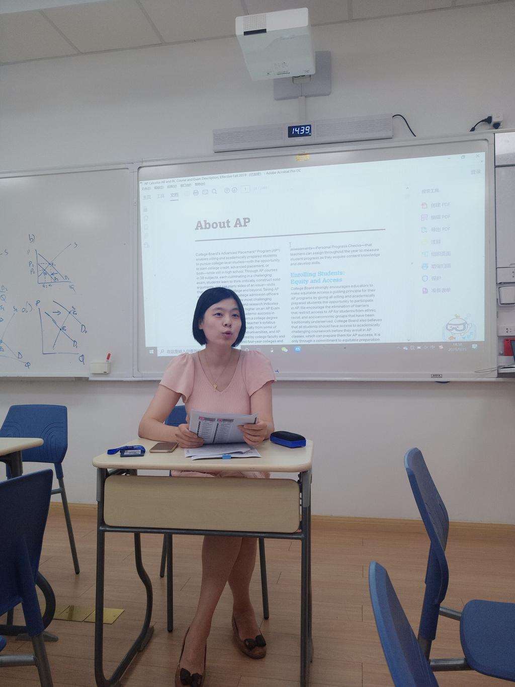 First, Ms. Ding Yi introduced the AP calculus course content and assessment format to the new teachers. Then the recent changes in AP calculus released by the college board were shared by Ms. Ding. This enabled all teachers to have a better understanding of AP calculus. Afterwards, attendees participated in a discussion about the connection between the school’s algebra II course and the AP calculus course, and how to make the students adapt to the intensive AP courses in a more efficient way. In addition, the similarities and differences between AP calculus and school calculus course were discussed aiming to seek a better approach to help students understand the rigorous nature of math, the enjoyment to be found in math, and strengthen their critical thinking abilities.