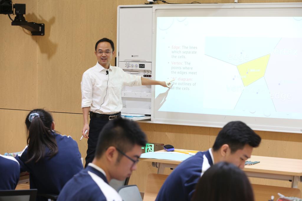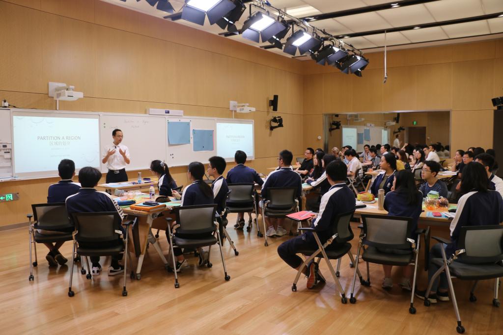 On the morning of Sep. 12, Principal Ma Feng offered a fascinating math demo class in the ZhenTao Building. In the context of region partition, Principal Ma raised two open-ended questions, both of which were close to real life: issues relating to children’s enrollment to the nearest elementary school and choosing locations for hazardous waste dumping. All of the students were deeply engaged by the course content and the Voronoi Diagram demonstration using Geogebra (a mathematical software). The invited guest teachers also greatly enjoyed the impressive class.