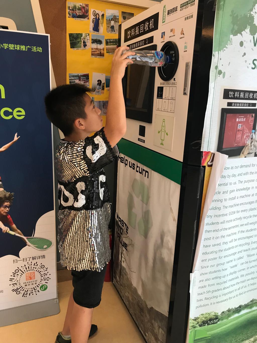 Because of this recycling activity, the 5th graders tried their best to recycle. Every day during recess, students can go to the machine and put in bottles that they’ve collected. During the Labor Day holiday, my neighbors and I took about 6 big bags and started collecting bottles that were on the on the ground. We even collected bottles from the garbage bins. When I counted the bottles, I found that I had already collected 74 bottles! One fifth grader even collected 323 bottles! How amazing!