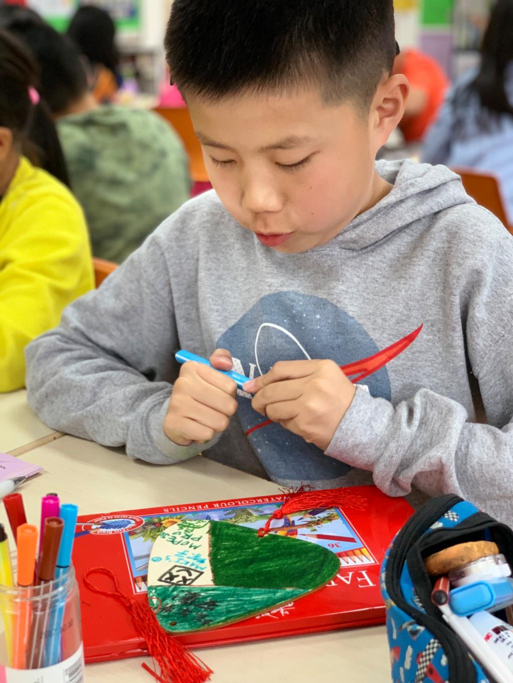 In a delightful mood, 4th grader teachers and students at SHSID Pudong campus celebrated the upcoming Dragon Boat Festival together on the afternoon of May 28th. In the P&B class, students learned about Qu Yuan and the interesting customs surrounding the Dragon Boat Festival. These included eating Zongzi, the traditional food for the Dragon Boat Festival and the Dragon Boat Race. In the Q&A competition section, students participated actively. In a heated discussion, they asked creative and thought-provoking questions. Among all the celebration activities, the most intriguing was designing hanging Zongzi decorations; the students showed amazing imagination and drew cute, amusing rice dumplings. Students and teachers celebrated the Dragon Boat Festival in a cheerful atmosphere.