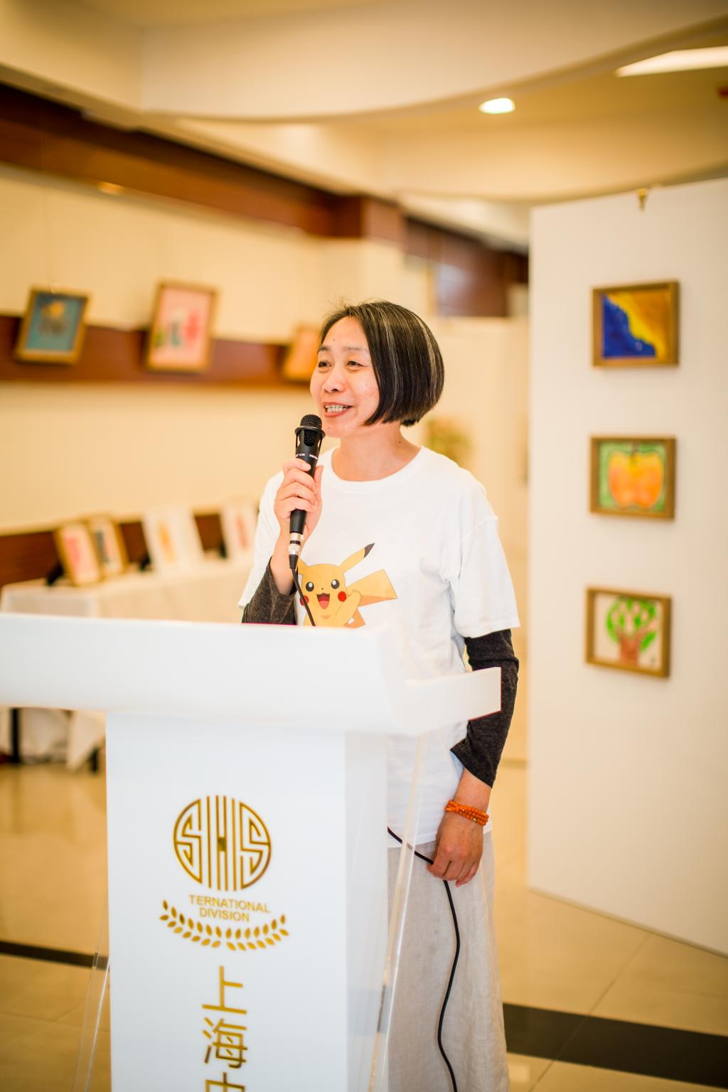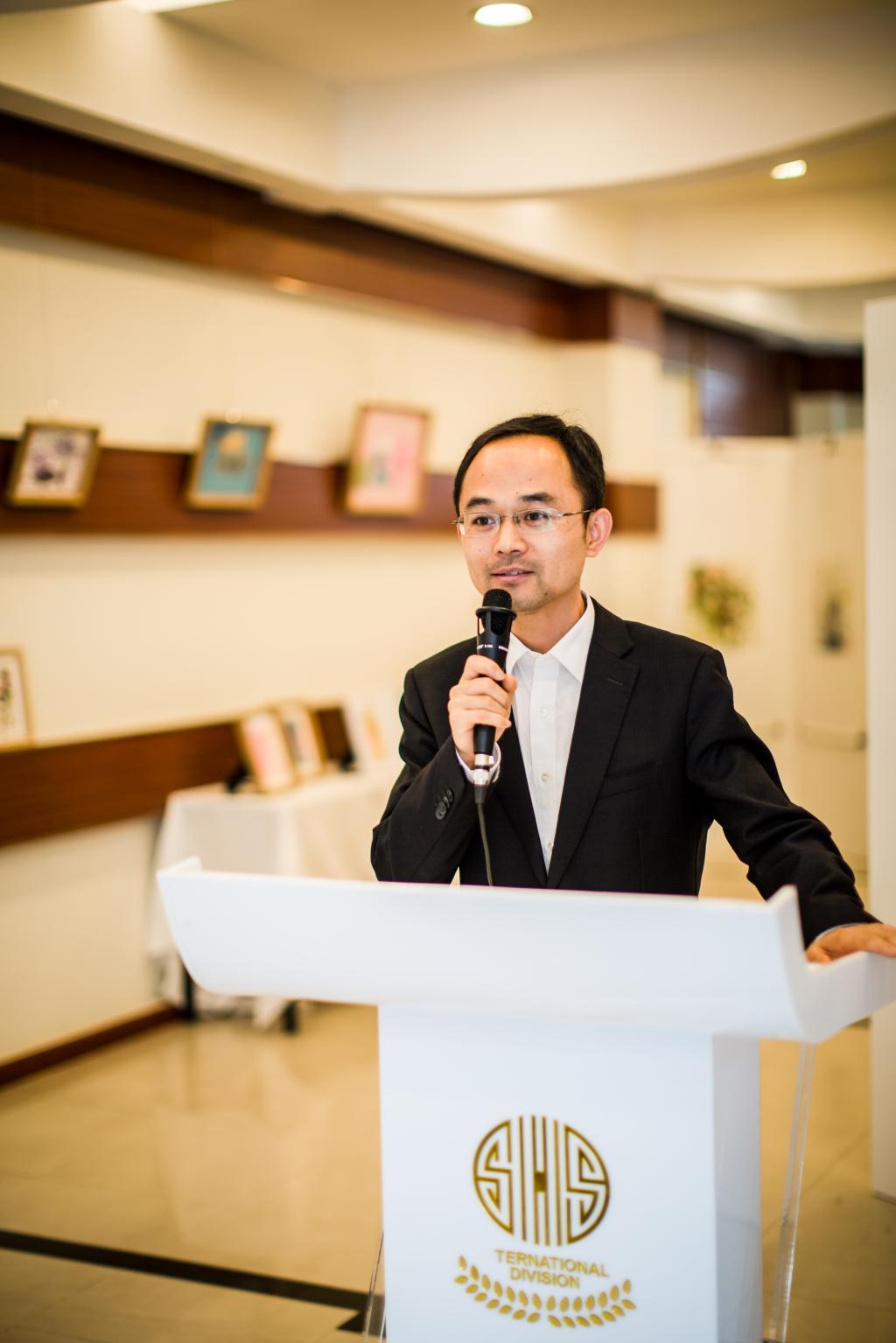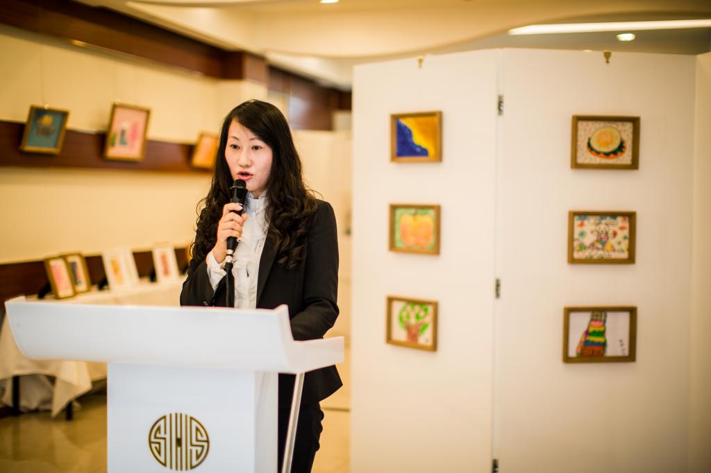 At 13:30 p.m., the opening ceremony, which was hosted by 11(1) Linda Lam, began with warm applause. First, Principal Jiang Limin of Xingyu Children's Center delivered an appreciation speech. Then, Ms. Jin Zhe, General Manager of Intco Recycling Resources Co., gave a speech and made a donation to Xingyu on behalf of Intco. Intco provided all frames and reels for the exhibition and also printed all of the artwork albums. At the end of Ms. Jin Zhe's speech, everyone applauded to express their sincerest thanks to Intco. Concluding the opening ceremony, SHSID High School Principal, Mr. Ma Feng recalled the scene when the Xingyu volunteers’ team was first established seven years ago. He told students in the audience that the purpose of charitable acts is not to exhibit them to others. Rather, charity work is an expression of an inherent sense of responsibility. That being said, Mr. Ma expressed his enthusiastic expectations for the Xingyu volunteers. He hopes that they may continue spreading their kindness and care through community service and devote their time and effort to every small action.