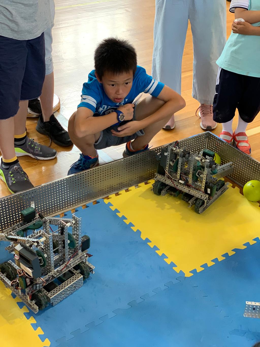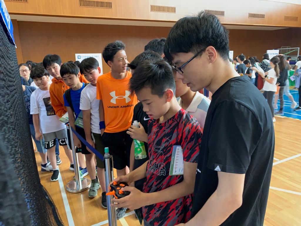 Of course, nobody could miss the epic activities in the middle of the gym. In the DIY activity, students made small model trains with wheels and had them drive down a sloped track to test if they would derail or not. The 6th graders really had fun at the the VEX and UAV (unmanned aerial vehicle) stations. At the VEX station, four players controlled four different robots and tried to transport three balls without being disabled by the other players. At the UAV flying station, students lined up to fly a UAV through a simple obstacle course. It seemed easy at first, but the UAV was challenging to control because the direction would change after it spun; there was also the possibility of getting it tangled up in the net.