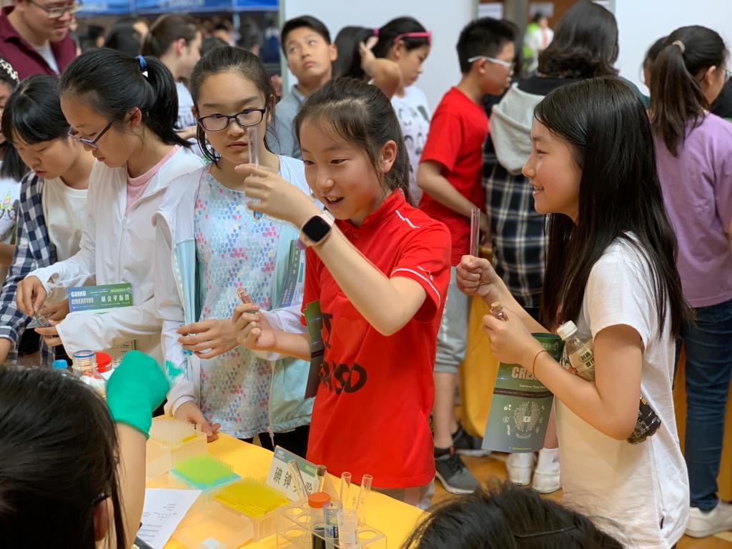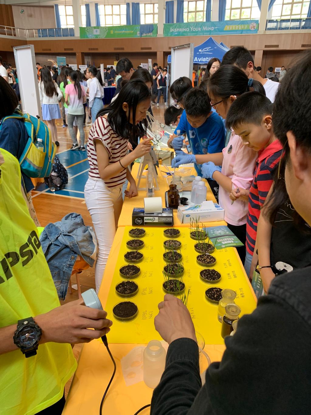 Down at the south side of the gym was the science section. From the CAS Organic Chemistry Institute to the Environmental Science Group, those at the science stations used their abundant knowledge and interesting experiments to show students the keys to different areas of science. Activities included observing a silkworm’s life stage, drawing bacteria specimens, and growing microbes underwater. Our school’s biology workshop teams presented their work and knowledge by making students perform fun experiments about several topics themselves.