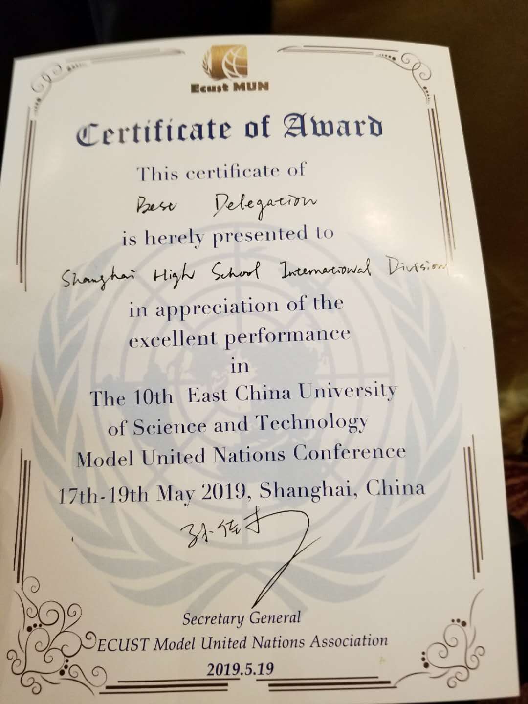 At the end of May, the Tenth East China University of Science Technology Model United Nations Conference officially began. Delegates attending this conference came from universities all over the country, including Dong Hua University, East China University of Political Science and Law, University of Colorado Boulder, and many more. At this conference, Shanghai High School International Division received multiple rewards. Over the course of three days of heated debates and drafting resolutions, SHSID was rewarded “Best Delegation”, and three delegates from our team of 7 received individual awards. Lucy Lu from class 8(9), as the delegate of Sweden from the United Nations Framework Convention of Climate Change (UNFCCC), received the award of “Outstanding Delegate”. Hazel Hu from class 8(1), as the delegate of Russia from the same committee, and Haoyang Zhang from class 7(5), as the delegate of Greece from the European Commission (EC), both received the “Honorable Mention” award.