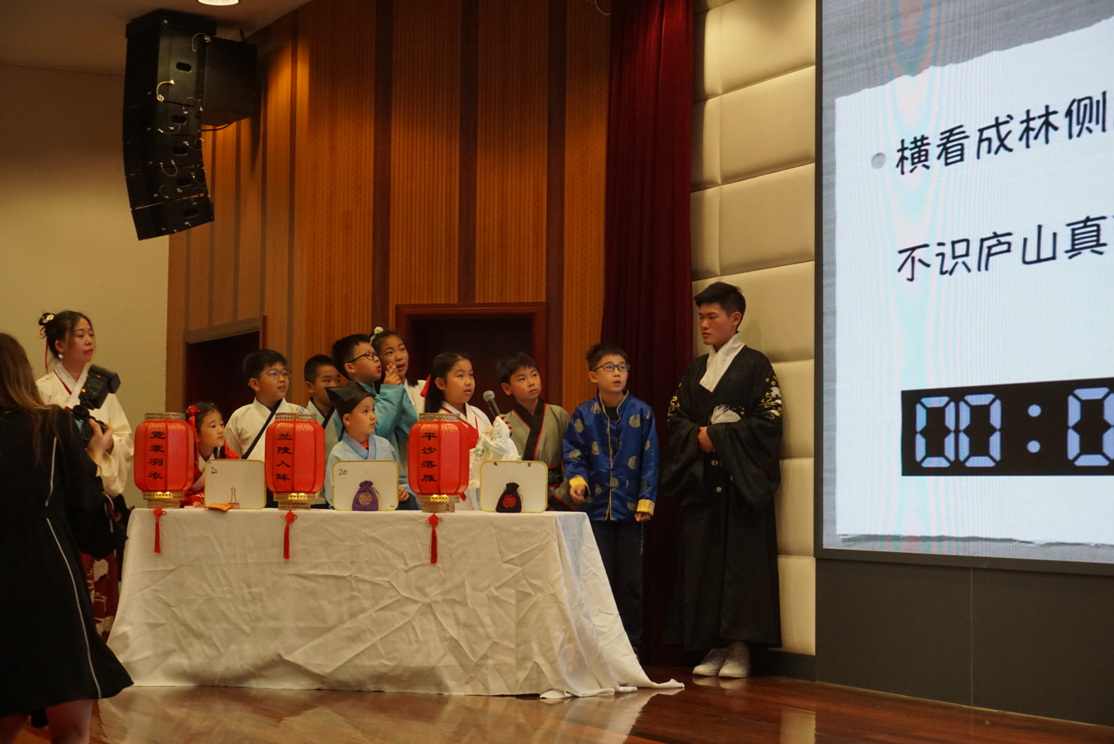 In each team, a third grader and a fourth grader worked with one student from Yifu Primary School. Altogether there were six teams, with each answering questions in order to win the prize. Each team had one chance to turn to their teachers or classmates for help. All the contestants performed coolly and confidently. They also wowed the audience with their broad range of poetry knowledge.