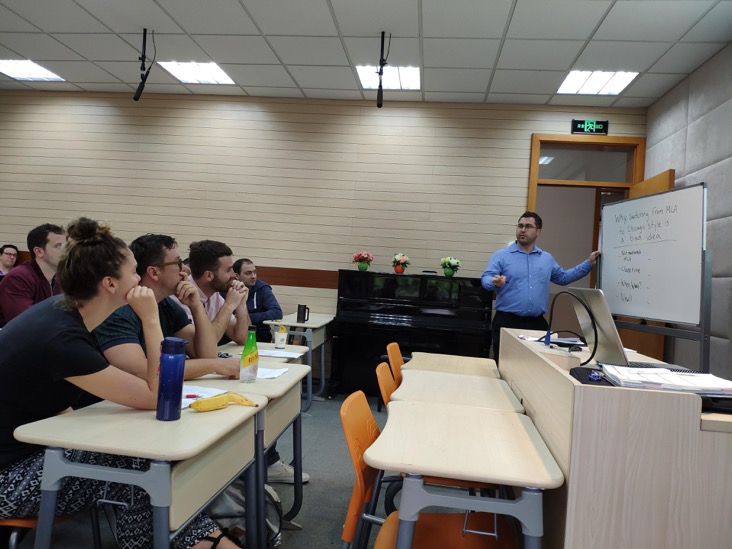 All of the History and Geography teachers met in room 127 of the Zhong Xing Building for their PD meeting. This time, the teachers discussed how to help their students improve in writing academic essays. Firstly, Mr. Bret Marshall proposed using Chicago, or Turabia citation style, which he believes is more appropriate for history groups to use instead of MLA. He briefly introduced the differences between these two methods and used examples to show the advantages of the Chicago method, which included a title page and footnotes. He also tried to respond to all the concerns from teachers about using the new method. He encouraged the teachers to make full use of BB and to design a Chicago style lesson plan for the students. Next, Mr. Josh Pickart shared his own experiences in essay writing as an H level and AP history teacher. He handed out a list of historical reasoning skills, components of an essay, writing process, feedback, and an example of an in-class activity for practice. He sees essay as review. Teachers can start from a simple step, like asking their students (from different grades and levels) to practice writing topic sentences and rewriting them with the help of their teachers. He believes if teachers collaborate with each other and standardize their way of teaching, or even achieve cross-curricular cooperation, students will find it easier to accept and improve their skills in writing historical essays. This meeting helped the teachers to learn more about how to guide the students in their academic writing.