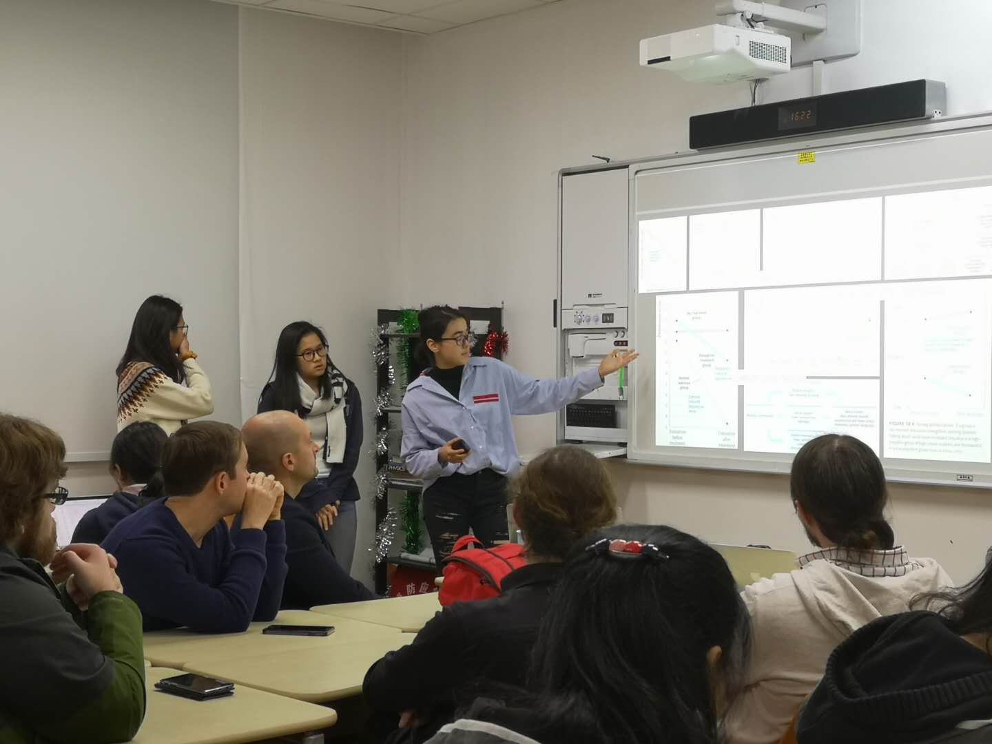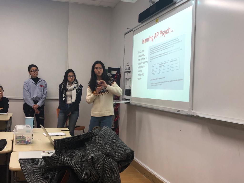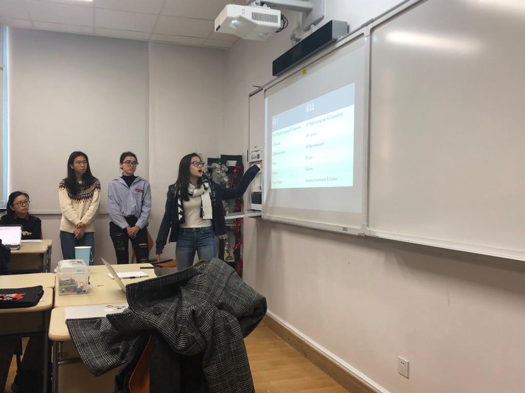 Fiona from 12 (6), Katelyn from 12(7), and Yanling from 12(5) briefly introduced their AP curriculum selections in Grade 11 and 12 to the teachers present. With extensive diagrams and examples of their experiences in various subjects, they explained that interdisciplinary learning will not only promote students to become better learners, but also have a tremendous impact on their future professional choices and life development. Taking AP English as an example, Katelyn discussed the great influence AP economics has had on her English writing as well as her major selection. Drawing from her own experiences, she explained that the ultimate goal of studying any subject is to apply it in the real world.