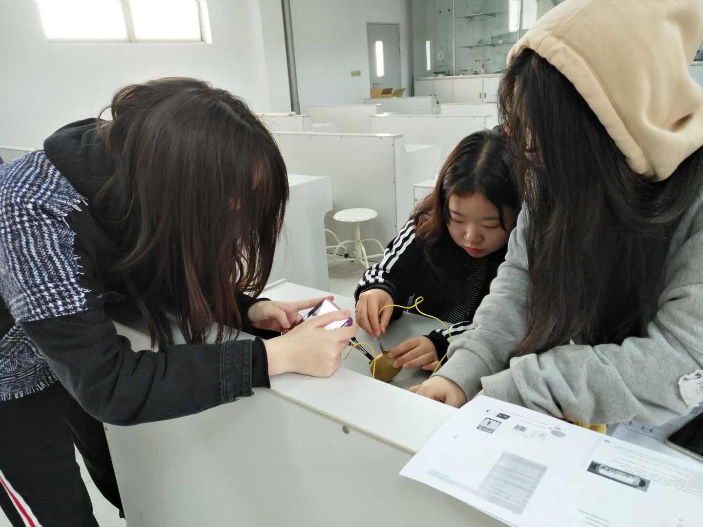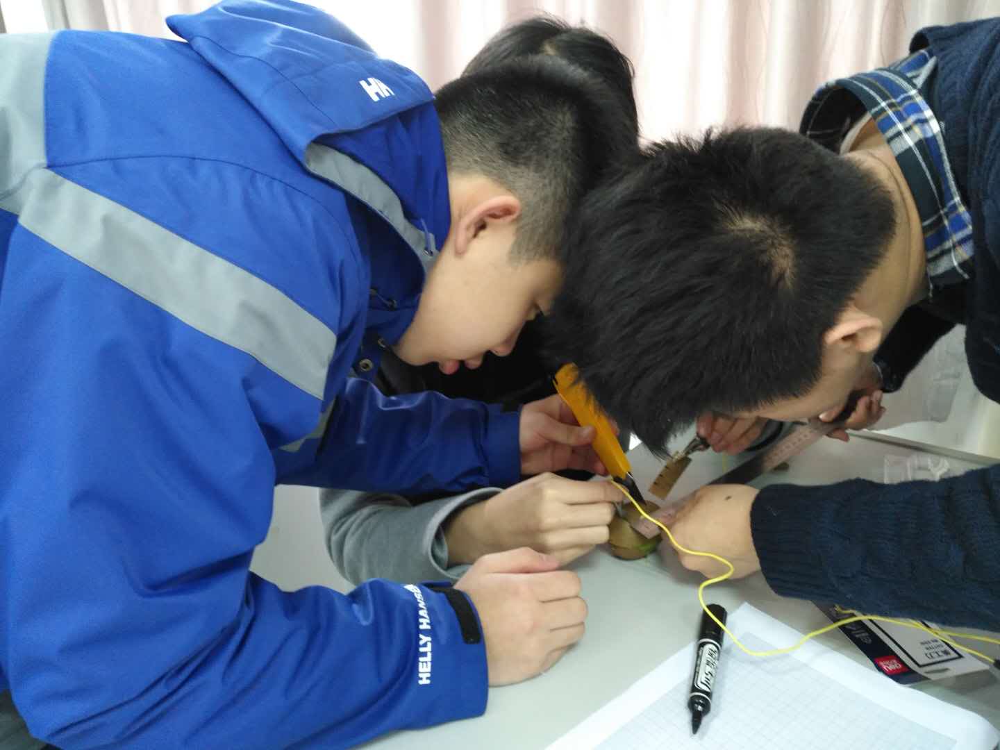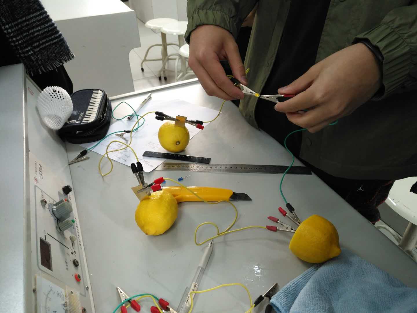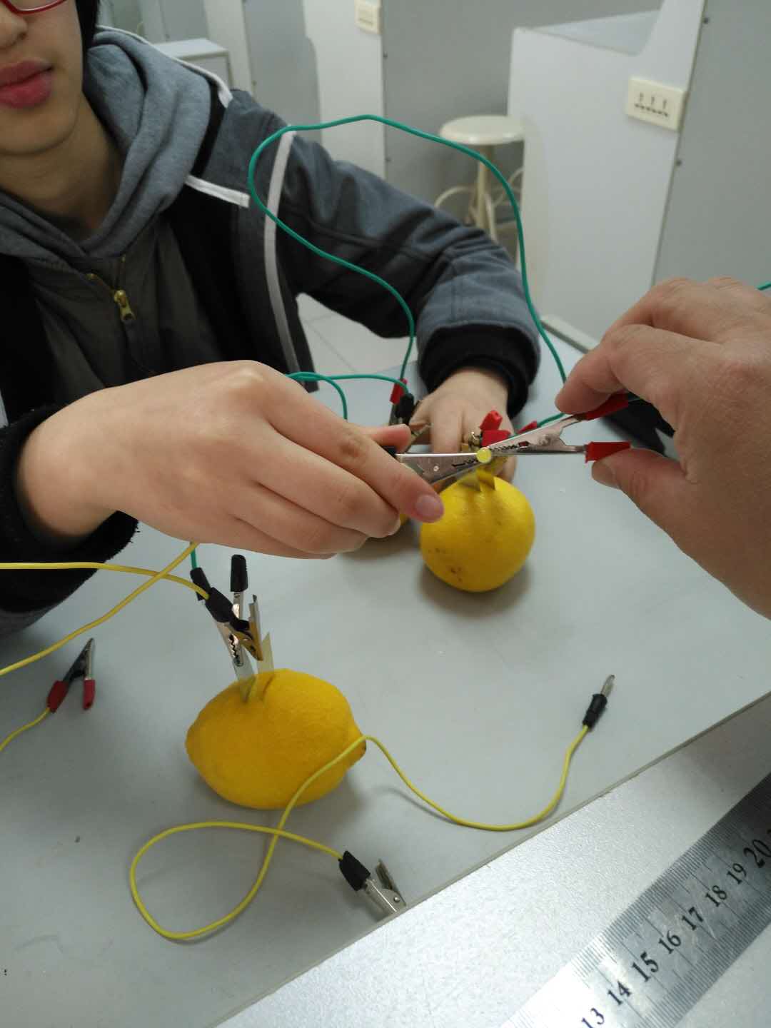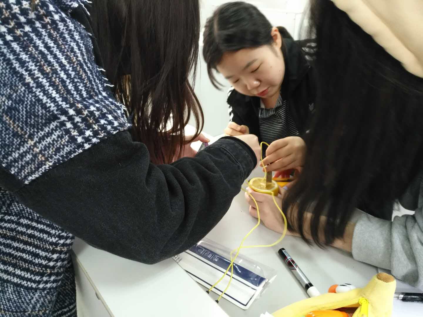 On the morning of March 25, students in the PBL class instructed by Ms. Zhang Wen took part in an interesting experiment: making fruit batteries. They made batteries using fruits such as lemons, oranges, and kiwis. Students measured the voltage produced by each kind of fruit and compared their magnitude. They also researched the change of voltage when the distance and depth of two plates varied. Finally, they connected several batteries in a series and illumed the LED successfully.