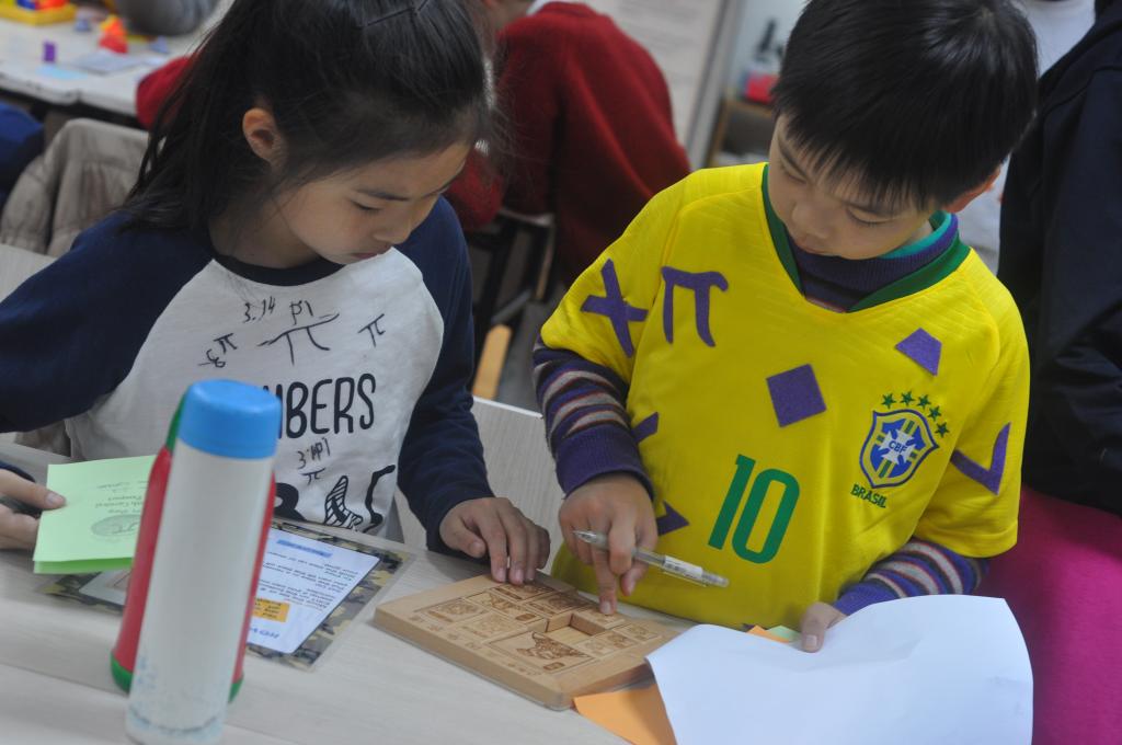 The most exciting part of this week was Pi Day. It is well known that Pi Day is celebrated on March 14th around the world. Pi is the symbol used in mathematics to represent the ratio of the circumference of a circle to its diameter—which is approximately 3.14. On the afternoon of March 14th, all of our Pudong students took part in the Pi Day Carnival with great enthusiasm. Students celebrated this day by creatively dressing up as mathematicians and experiencing different math events. People enjoyed a game called “Where is the Time” in Class1-1, which required a candidate to find numbers related to the clock time in the classroom. Some of our students chose to play the Math Board Game and Tangram in Class 2-1 and Class 2-2. Games such as Rounding Bingo in Class 4-2 required participants to calculate intensively in seconds. Admittedly, the atmosphere was tense when the competition began, however, all the students tried with great effort to get higher scores and win more medals.