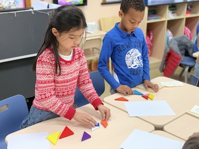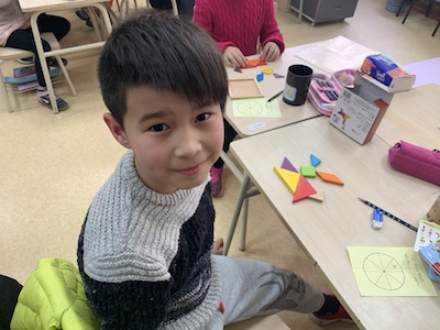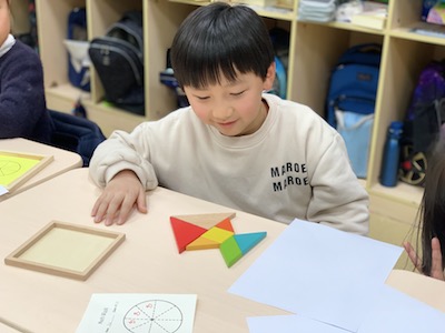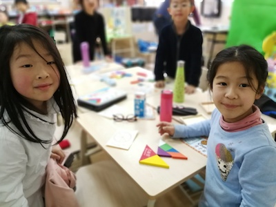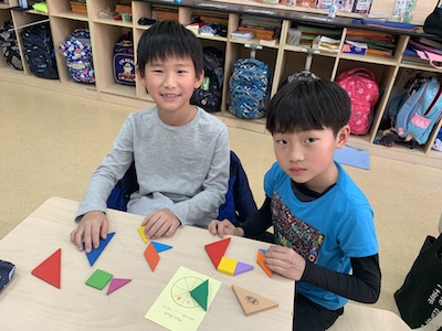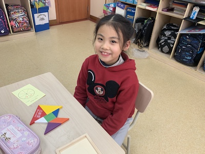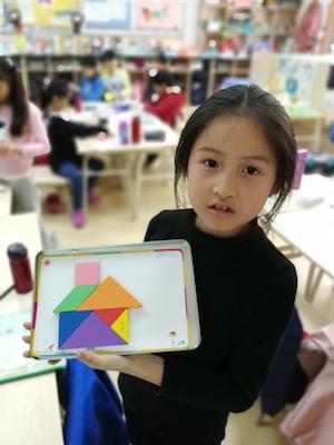 During Wednesday’s Personal Growth class, all the second graders got to know the wonder of tangrams. Invented in China thousands of years ago, a tangram is a two-dimensional re-arrangement puzzle created by cutting a square into seven pieces. Using those simple pieces, people could make a variety of complex shapes. After learning the technique, the students tried to use tangrams to make many shapes. They made cute bunnies, colorful fish and even a giant whale. They each tried very hard to solve the puzzle. Playing with tangrams lets students get used to basic geometric shapes while also developing their imagination and creativity. We hope that the students had fun and found the joy of math in this game.