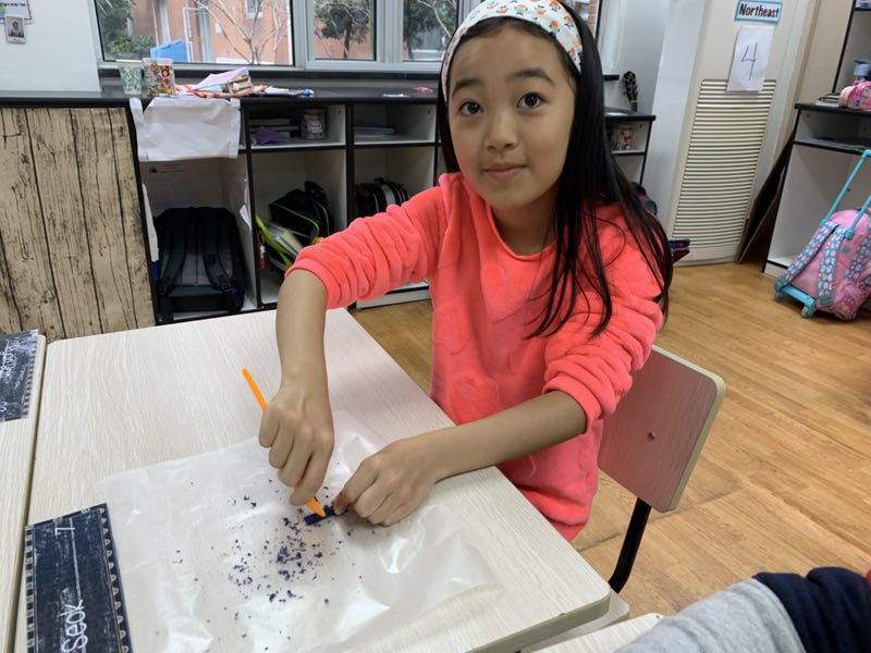 Once students grasped the foundational knowledge of the types of rocks, they put on their scientist lab coats and became geologists! Students used broken crayons as stand-ins for igneous rocks. They scraped the crayons to create “sediment.” While students scraped the crayons, they discussed that in real life, the wind and water would be causing these changes to the rocks. The next step was to create a sedimentary rock! Students compressed their newly created sediment into layers, discussing that this would normally take several hundreds of years. After students created their sedimentary rocks, they used pressure and heat (from an iron) to change their sedimentary rocks into metamorphic rocks. The high heat and pressure caused the sedimentary rocks to become metamorphic rocks.