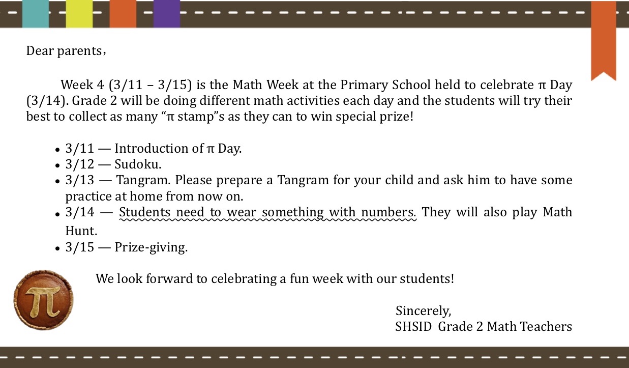 The second-grade activities we have planned are very interesting. On Monday we learned about π and on Tuesday we played Sudoku. We will make the Tangram on Wednesday and play math hunt on Thursday. During the rest of the week, students will collect eight stamps and use the stamps to trade for presents from teachers on Friday.