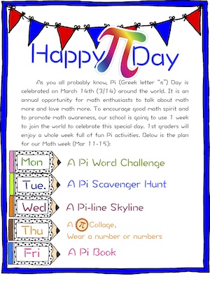 Pi Day is celebrated on March 14th around the world. Pi (Greek letter Π) is the symbol used in mathematics to represent a constant and the ratio of the circumference of a circle to its diameter, which is approximately 3.14159. Because Pi Day plays a very important role in math, the week of March 11th to 15th will be Math Week in the Primary Section of SHSID.