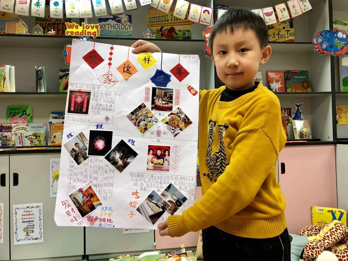 During the second week of this semester, Pudong Grade 2 teachers decorated the boards in the hallway with students’ excellent winter holiday projects. First, the students needed to present their projects to their classmates. After their presentations, the most popular projects were posted in the hallway. There are now a lot of interesting projects exhibited in the hallway, such as the math project “My dream city”, which is made of a variety of solid figures. The students’ traditional Chinese New Year posters also bring color and beauty to the hallway. With the addition of these delicate projects, the hallway looks even better than before. At SHSID, students make a lot of creative projects based on what they learn in class. This is why the kids are always so happy to learn.