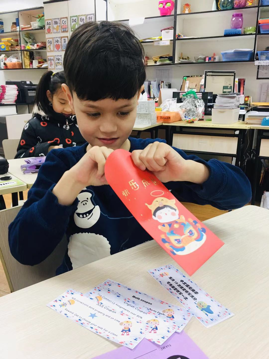 It’s exciting to receive red packets over the Chinese New Year, and it’s surprising and thrilling to be handed a red envelope from teachers at school. The students couldn’t wait to open their red envelopes. Interestingly, it was not money that was found inside, but gifts specially prepared by the teachers: 1 note of praise and 4 coupons. Each note contained new semester blessings from the teachers to their students. The coupons are a part of an encouraging scheme tailored to address the four main subjects. Hopefully, this will encourage students to treat each day’s homework seriously and to start forming good study habits from the very beginning of the new semester. When a target is achieved, students will be able to ‘cash-in’ the coupon and use its privileges.